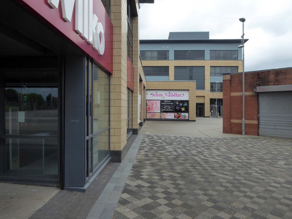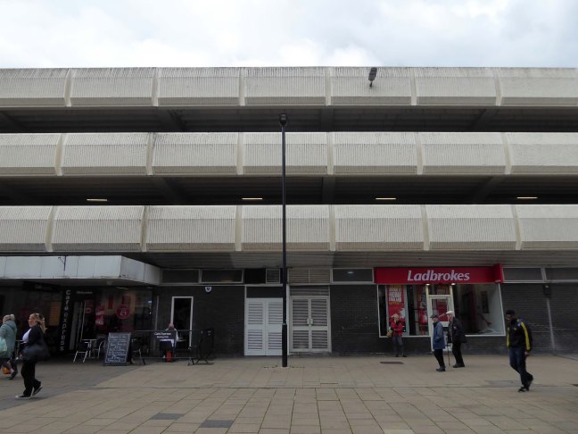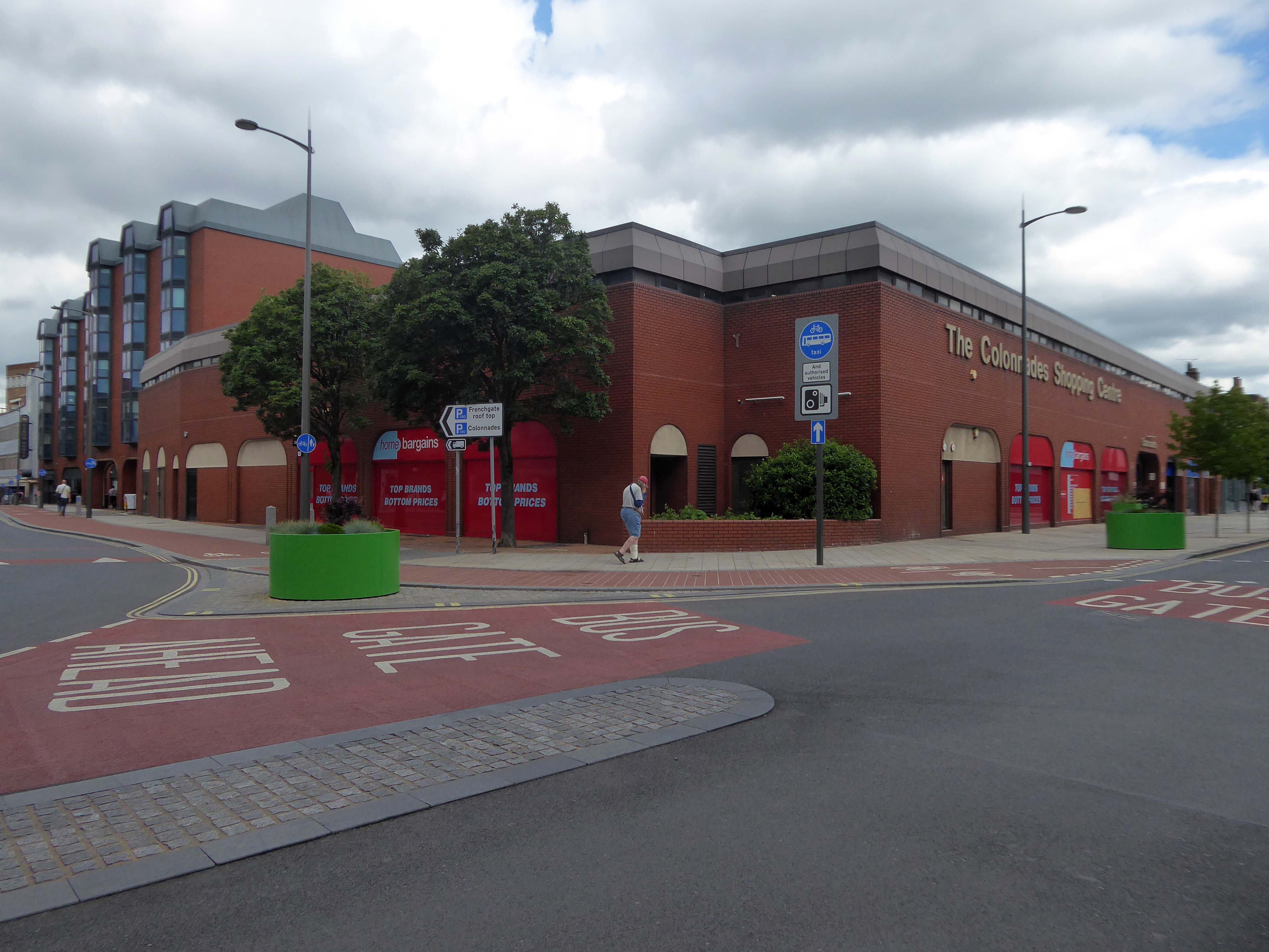 To the left the Colonnades Shopping Centre a fierce angular glass and brick bunker of mixed office and retail space – the sole occupant seeming to be Home Bargains.
