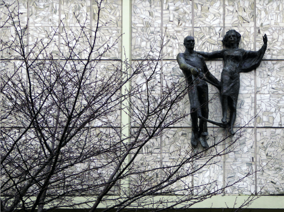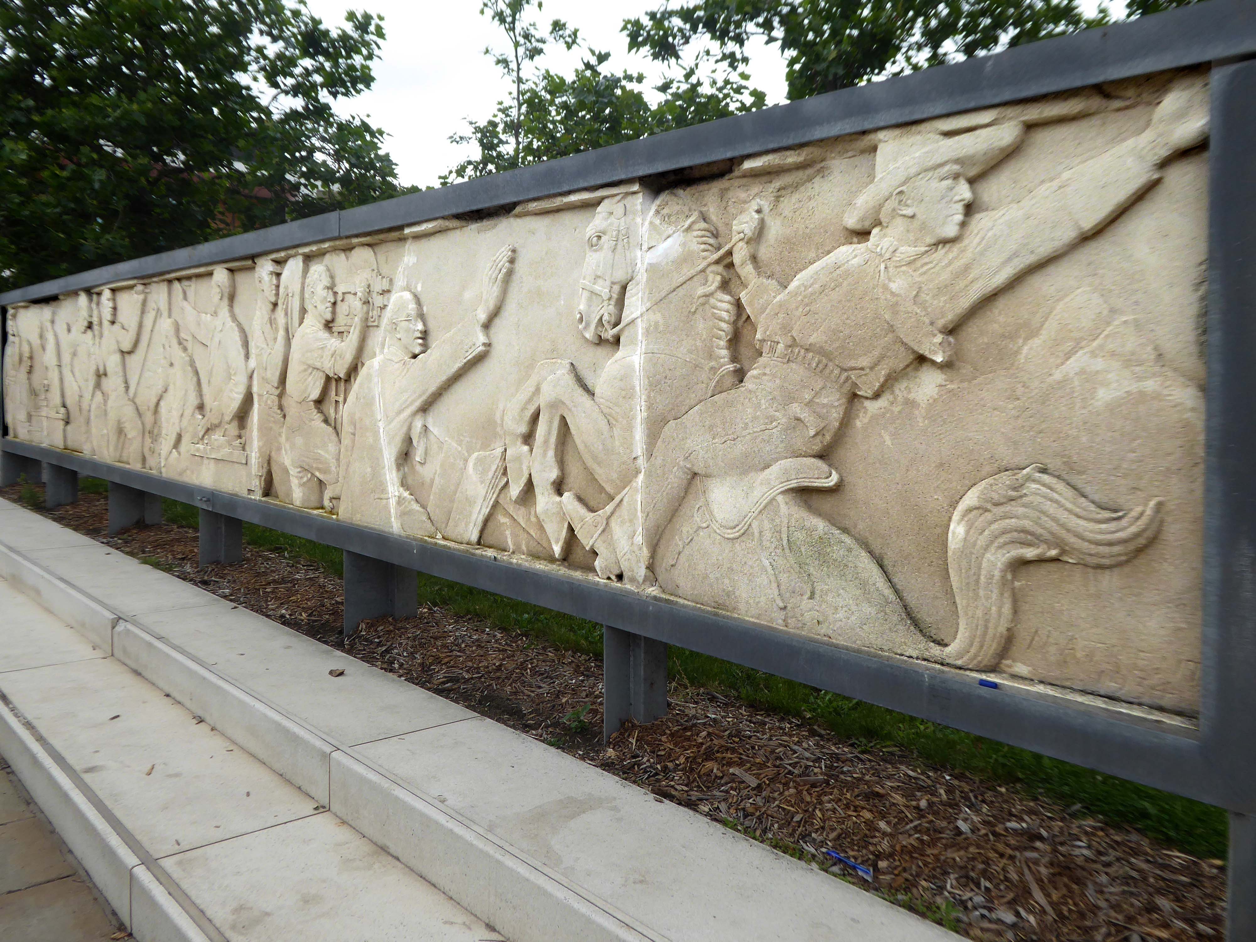 Within the square is a frieze, salvaged from the former Gaumont Cinema, the work of sculptor Newbury Abbot Trent.