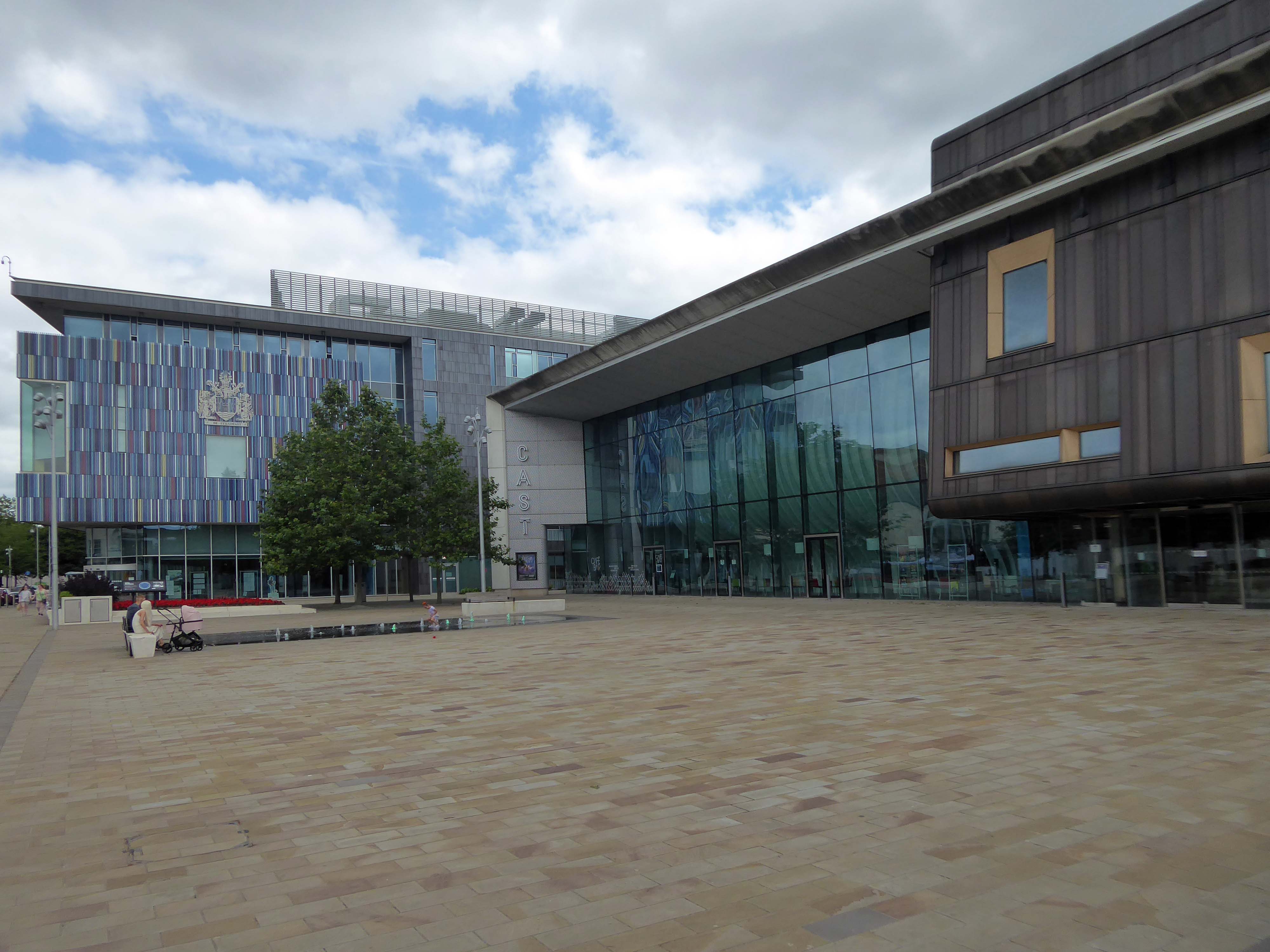 Facing the former library we find the CAST Theatre, Civic Buildings and Savoy Cinema, grouped around Sir Nigel Gresley Square.