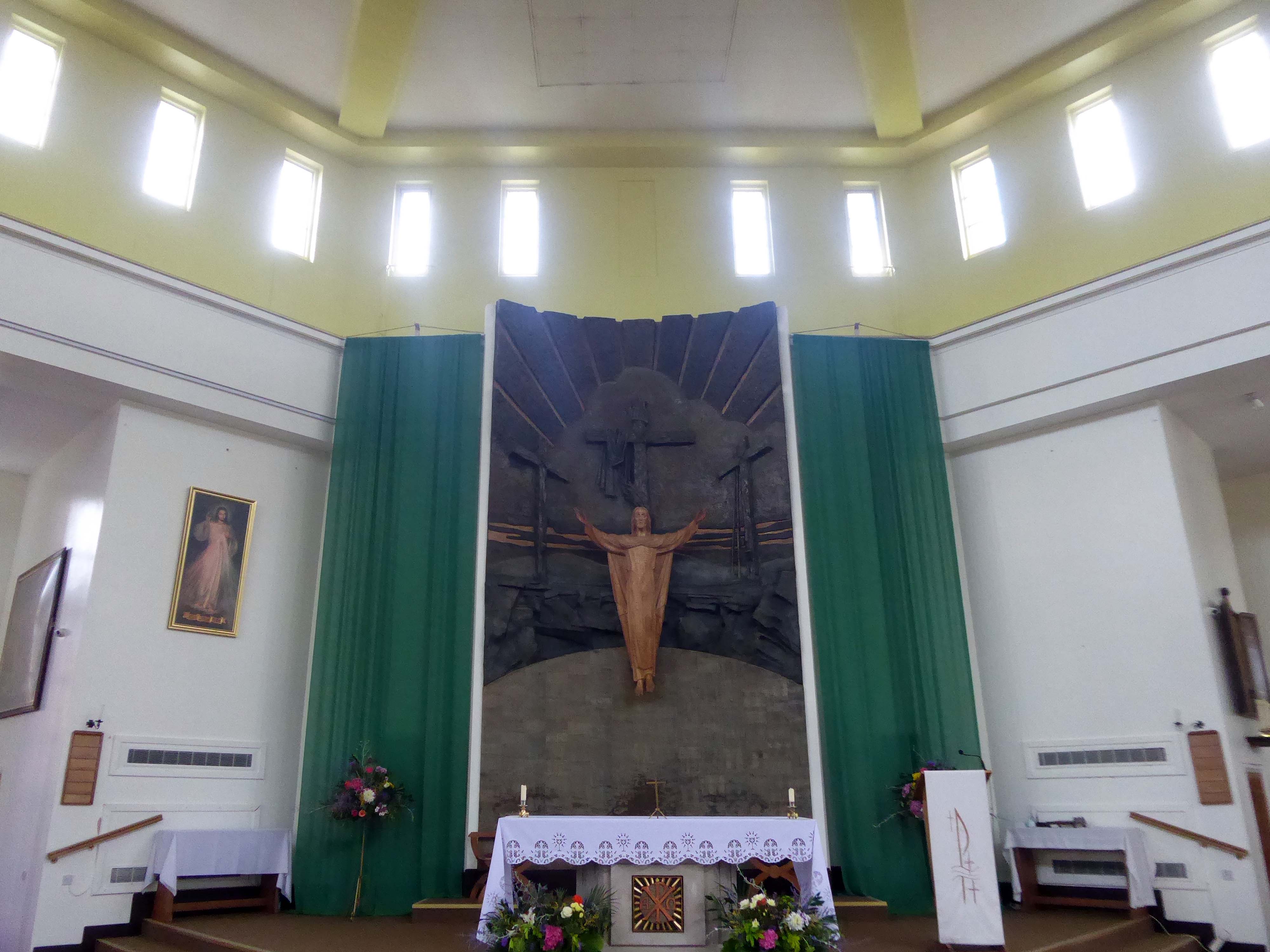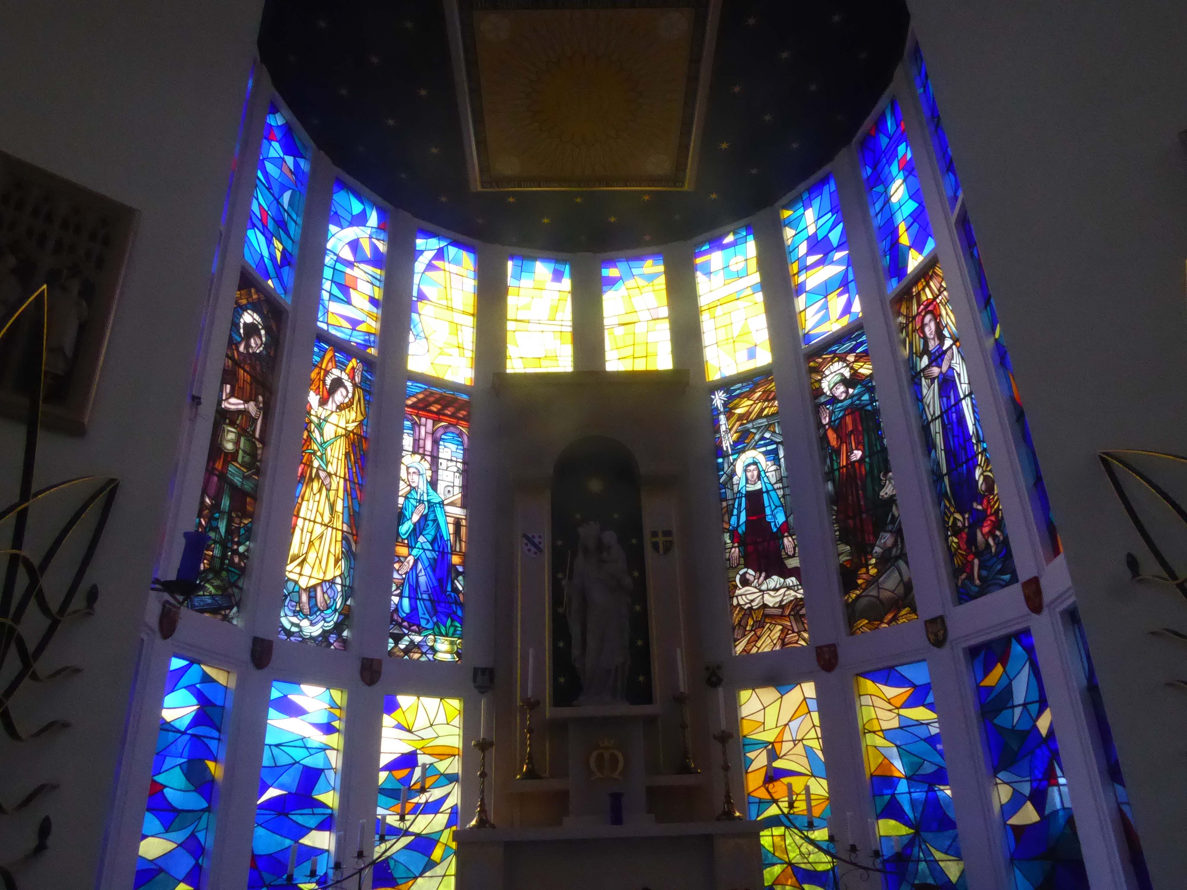 Figurative stained glass by Patrick Feeny for Hardman in 1973 and abstract glass fitted in 2000 as part of reordering and revival of the shrine.