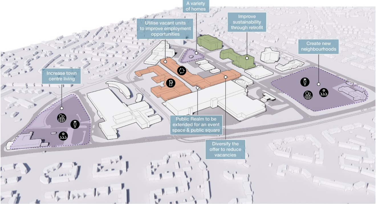 - Developing the civic and cultural quarter and reinforcing the retail and leisure core through better links and public space improvements.