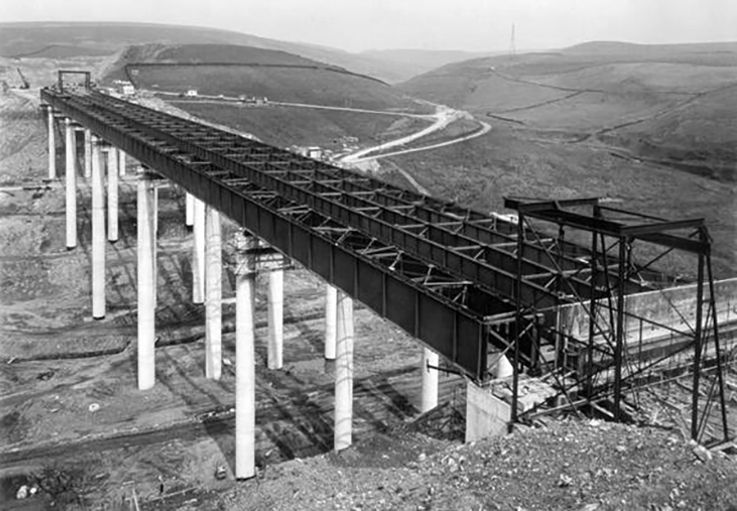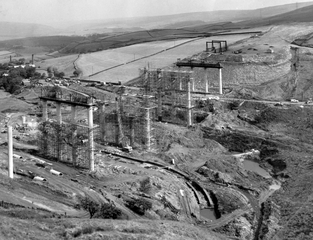 The viaduct is 280 yards long and 140 ft above the valley floor. It was built in 1966 by Reed & Mallik and opened to motorway traffic in October 1971. It has a sister bridge, the Gathurst Viaduct in Wigan, which carries the M6 motorway over the Leeds & Liverpool Canal, the Manchester-Southport line and the River Douglas and was constructed before the Rakewood Viaduct.