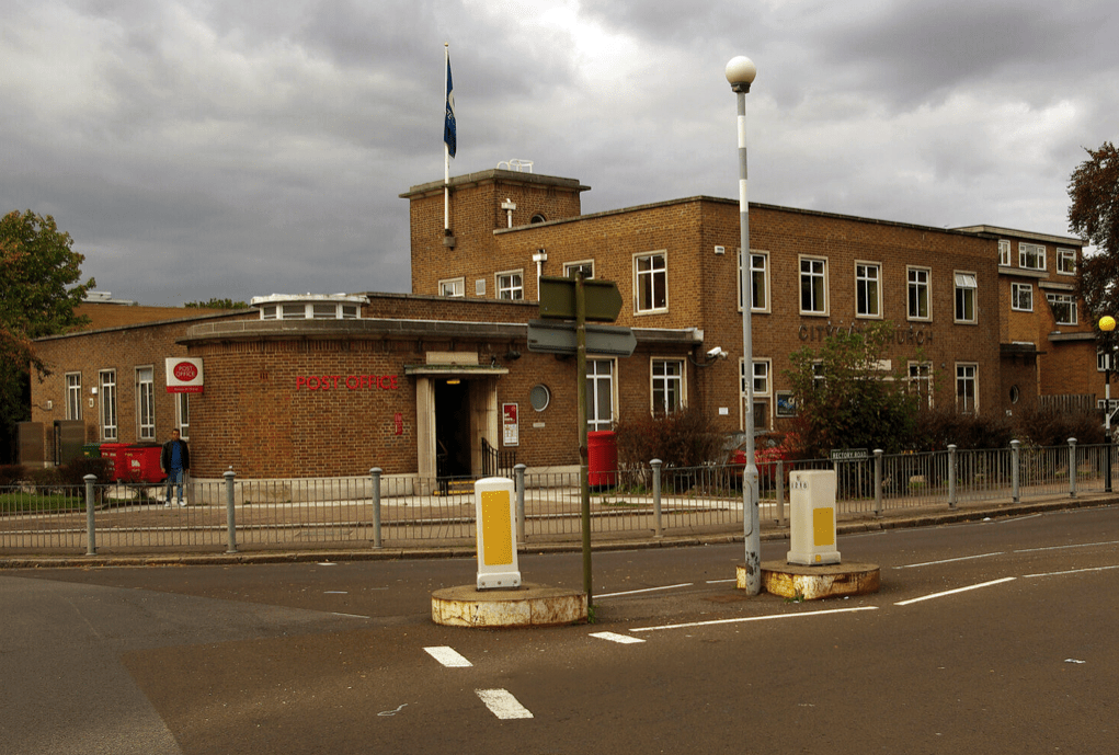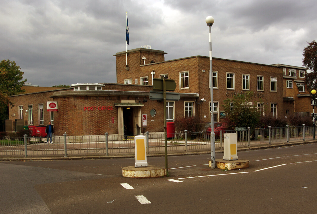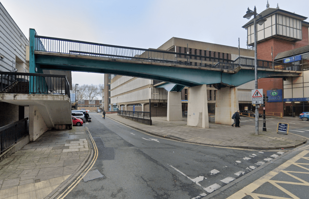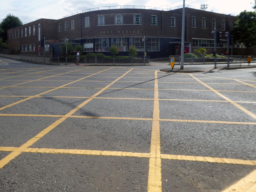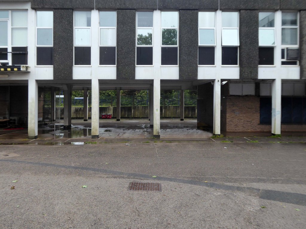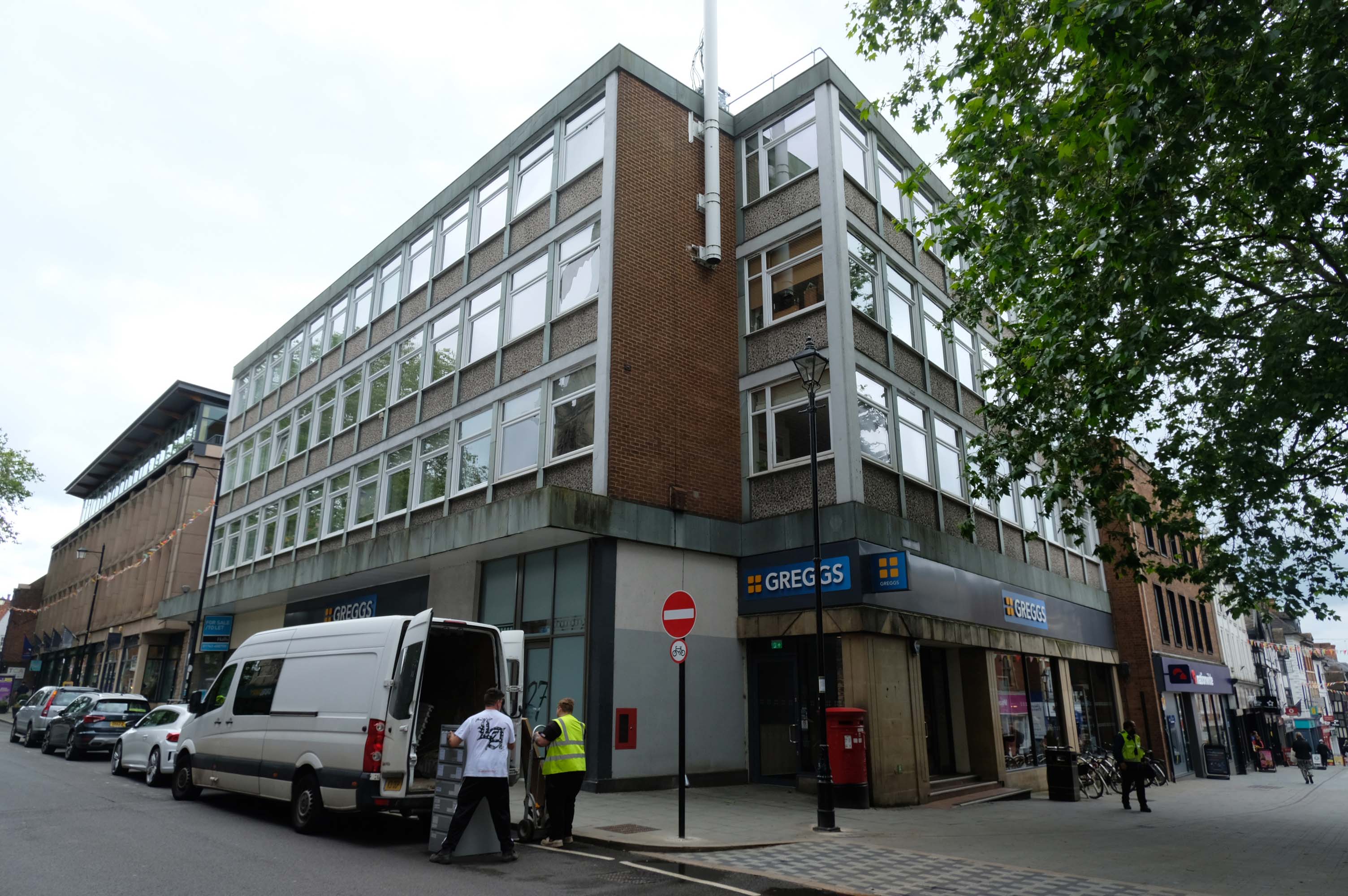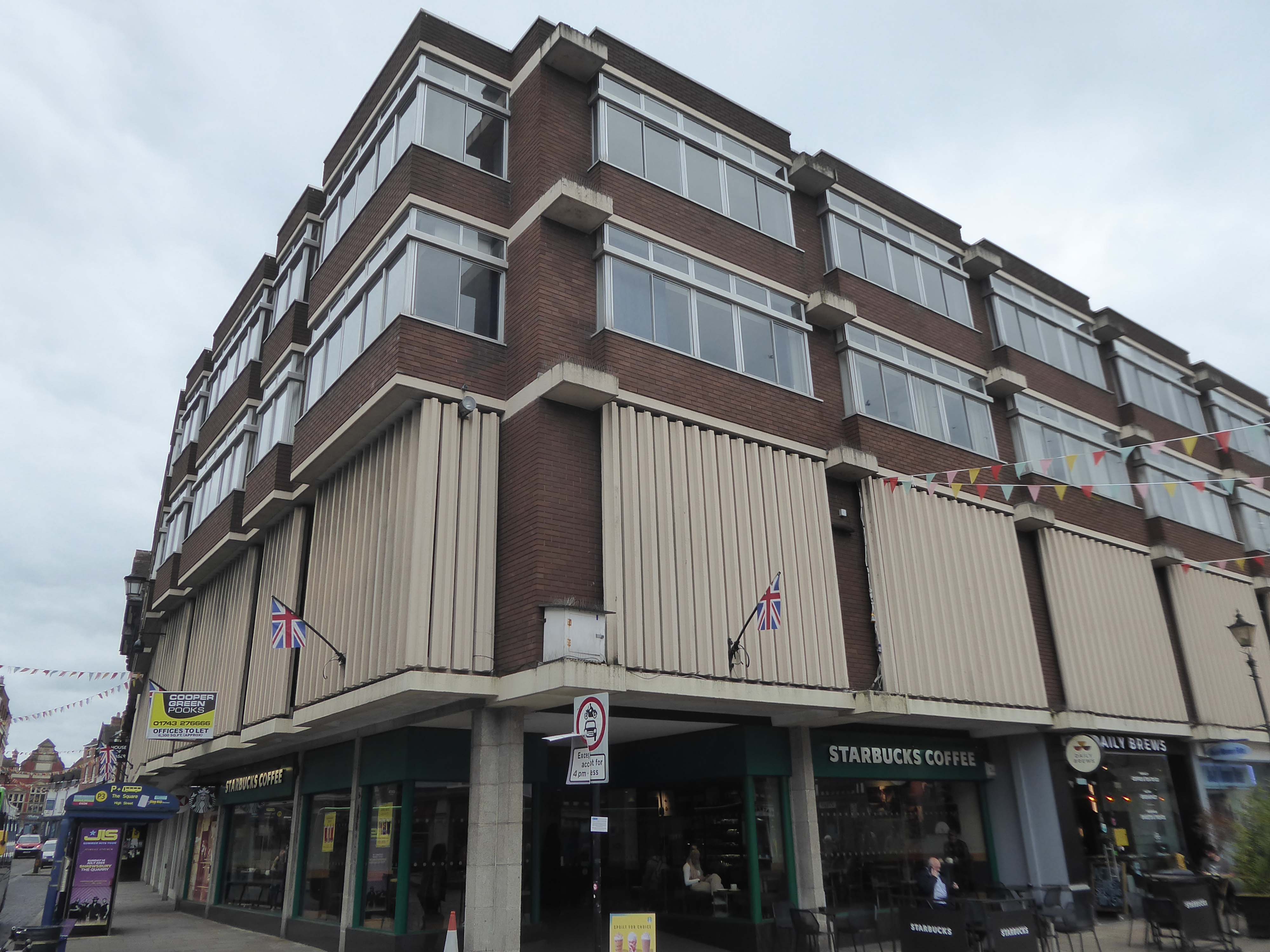 Across the way, a 60s corner site development, with a dual-entry Greggs.