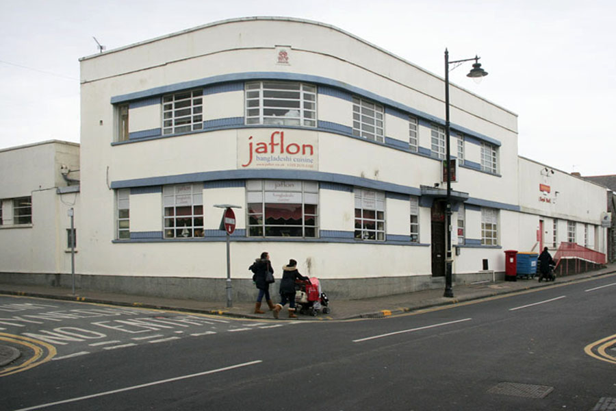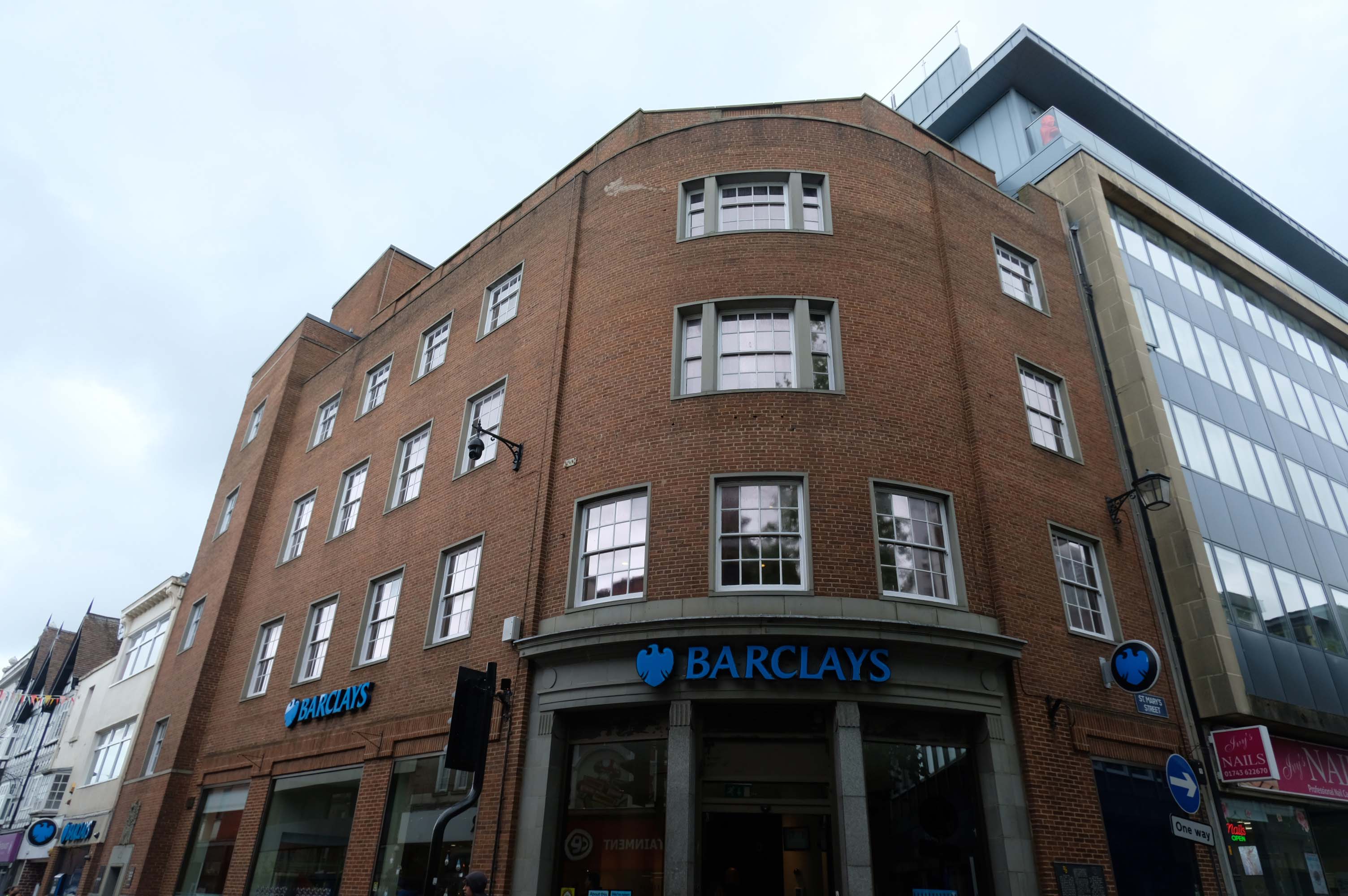 On the adjacent corner a curvaceous Barclays Bank, built in the post war Ministry of Works manner.