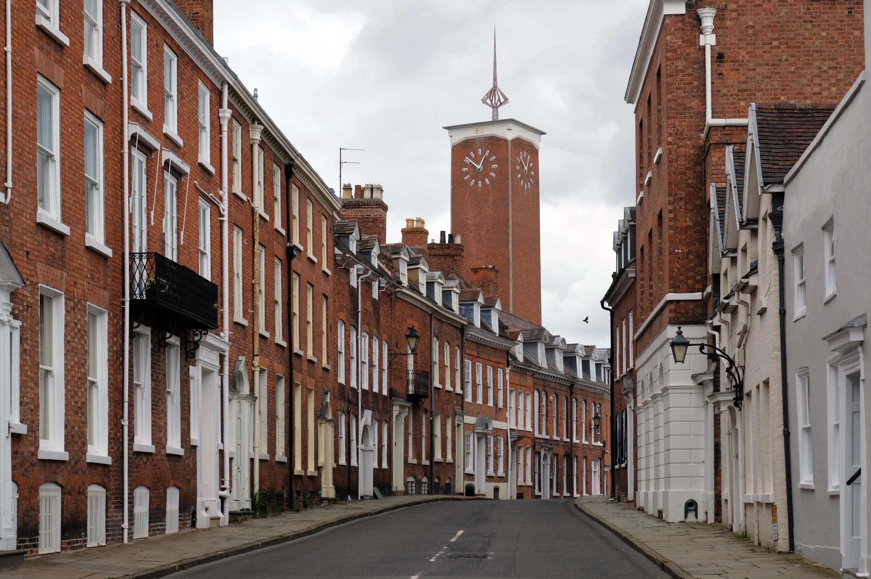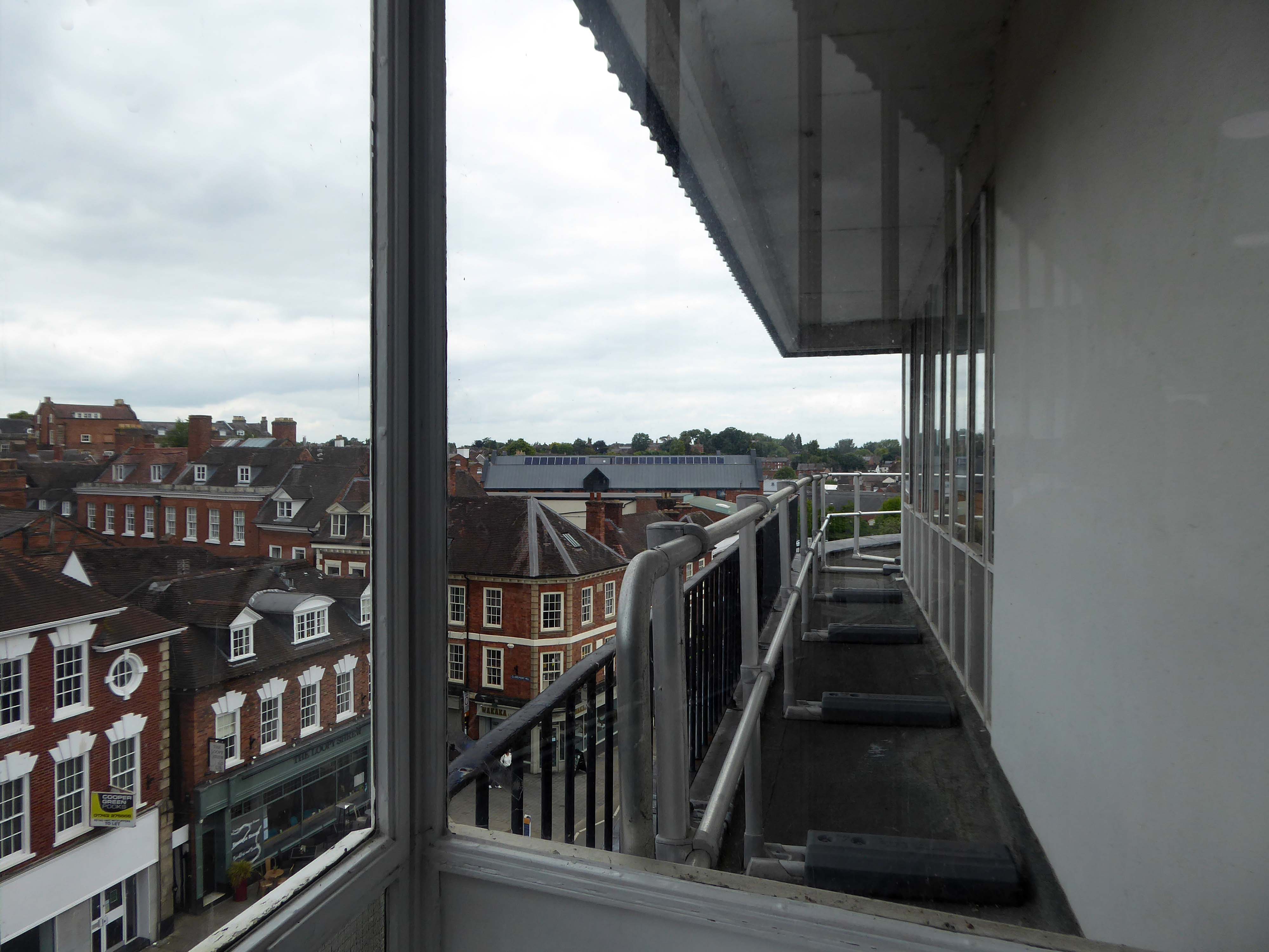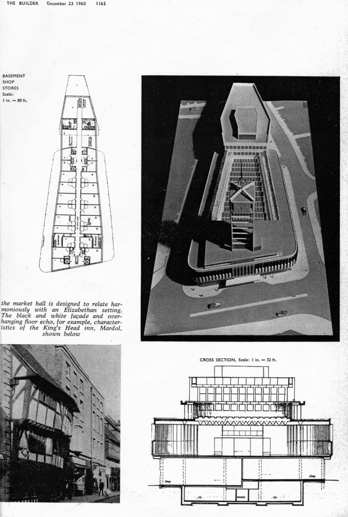 The Pevsner Architectural Guide pronounced the new Market Hall “a good example of modern architecture”, with “its clean lines and simple forms. But the town’s timber-framed tradition is also evoked. The upper storey is jettied out on a reinforced concrete structure and faced with vertical fins in an echo of close studding,” it stated. “The tall slender red brick clock tower mingles effectively in distant views with the town’s medieval steeples.”
