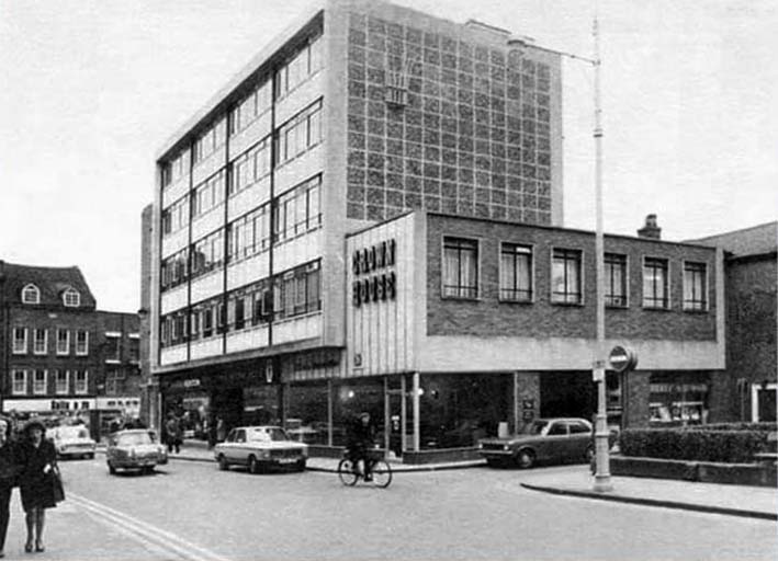 It was also shortlisted for the European Cement Association awards, one of only two British buildings to make the grade. Opting to draw on the Tudor traditions of the town, partner W Marsden, working with project architect W Allan Clark and assistants Malcolm Lovibond and Keith Maplestone, used cantilevered floors, vertical structural and sub-structural members, oriel windows and a black and white tonal palette deploying anodized aluminium window frames against finely ribbed concrete panels. The standing seam zinc roof adopted the town’s norm of pitched roofs without gables in order to blend with the street scene. Concrete Quarterly referred to it as ‘a skilful bridging of the centuries in a way that would not offend a purist’ . The main contractor was Henry Willcock and Company Limited.