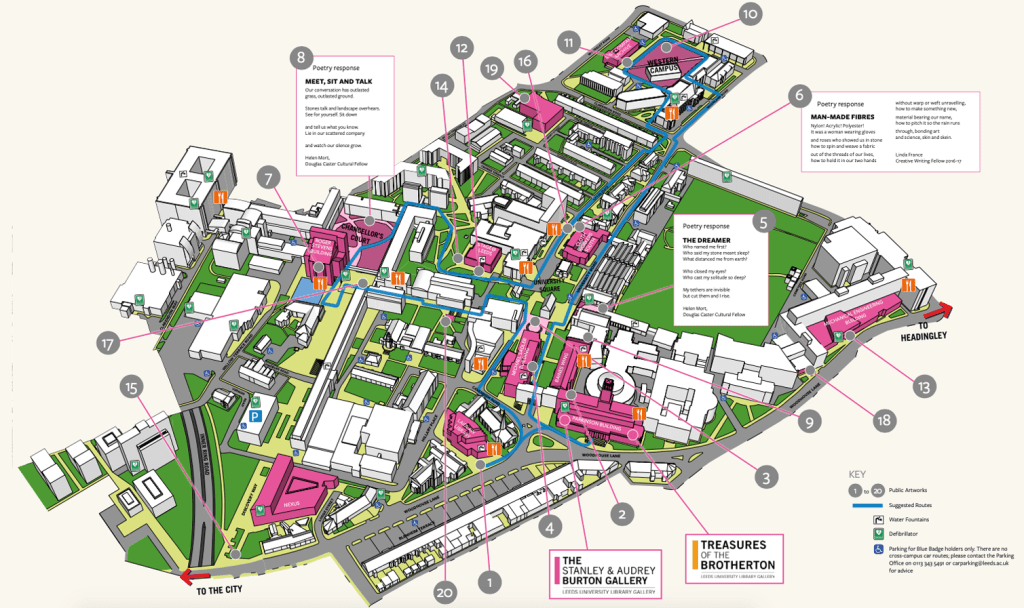 The University of Leeds has a long established collection of public art, this has now been formalised into an Art Trail around the campus. Each of the pieces on this largely accessible display, has a QR code with a supporting audio tour, along with an information panel.