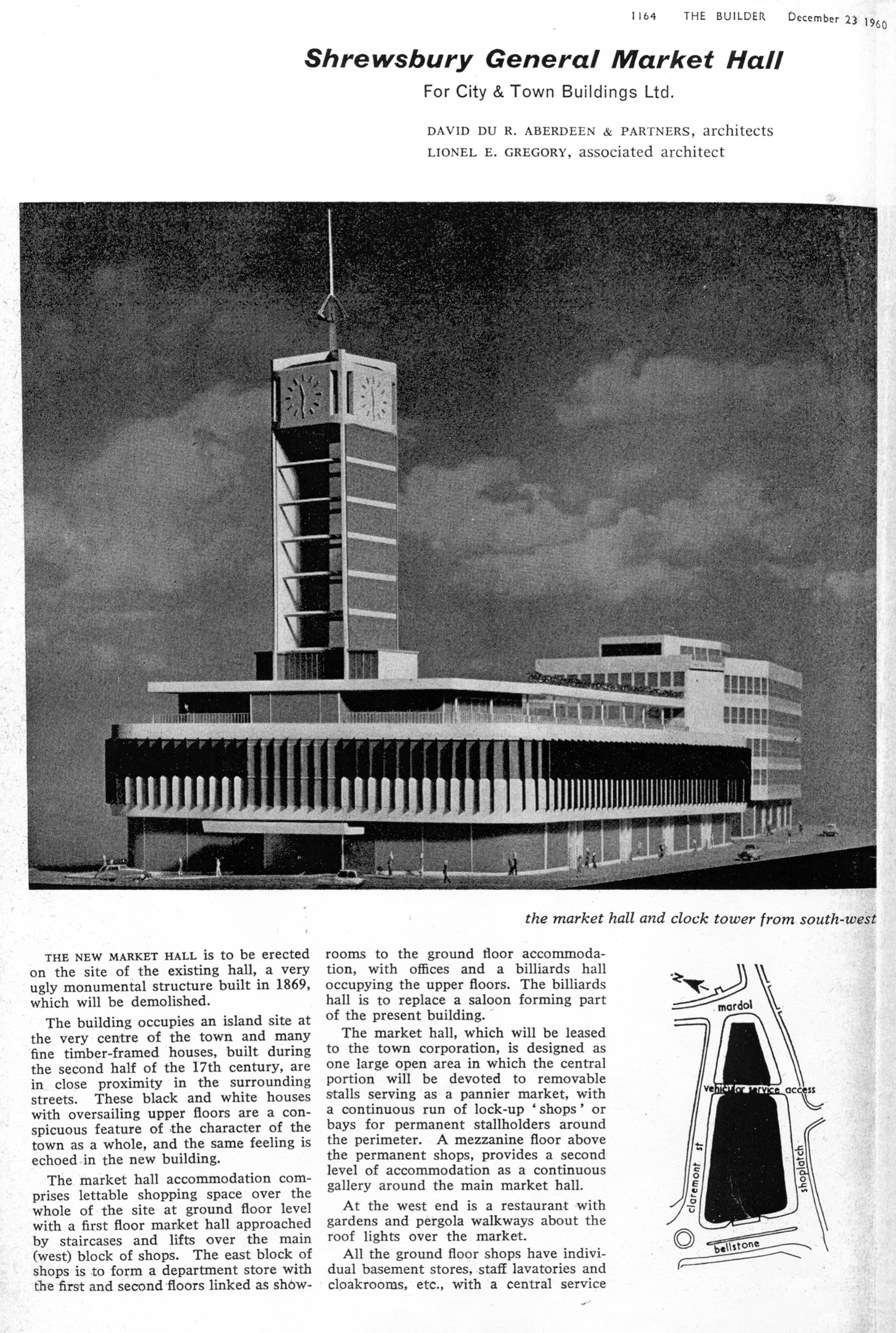 Possibly Shrewsbury’s finest post-war building, but of course it has its detractors. It was well received by critics of the period including the assessors for the Civic Trust who bestowed an award in 1968. They noted the quandary that the architects faced of building in such a historic setting and terminating the vista along one of the town centre’s main streets. In their opinion the architects ‘faced the problem squarely and their building, brave in its conception and immaculate in its detail’ and that it was ‘uncompromisingly of today but beautifully sympathetic to the great buildings it rests with’. Pevsner’s original assessment of it being the ‘boldest modern response to the town’s half-timbering’ was not shared by the authors who revised the Shropshire edition and viewed it as an ‘aggressive display of exposed and textured concrete’.