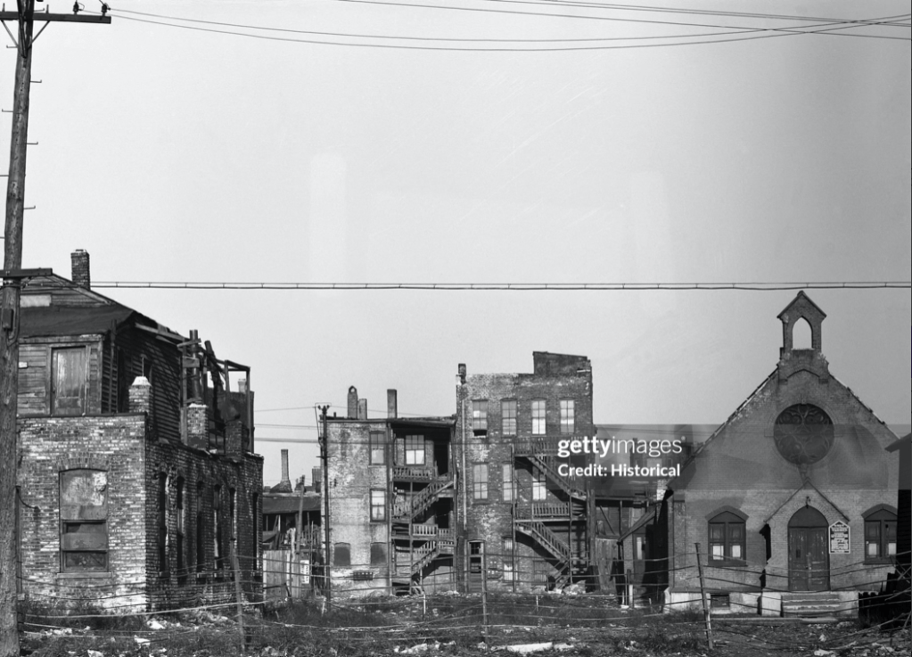 The cover image of Chicago tenements was taken in April 1941 by Russell Lee, for the Farm Security Administration.