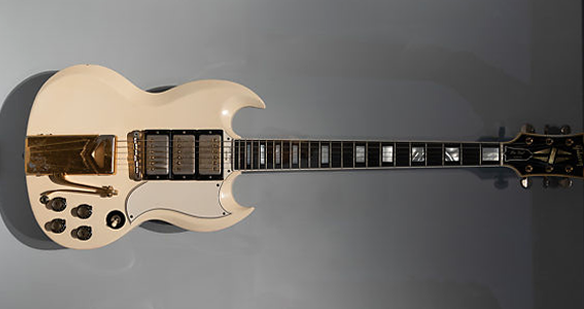 Sister Rosetta a force of nature slinging a Gibson around with righteous verve, a white Les Paul Custom, in 1961, Gibson redesigned the Les Paul model with a thinner, lighter body, a flat top, and beveled and pointed double cutaways. After Les Paul rejected the new design, Gibson rebranded it as the SG Solid Guitar Custom model, and it became the company’s high-end solid body of the early 1960s