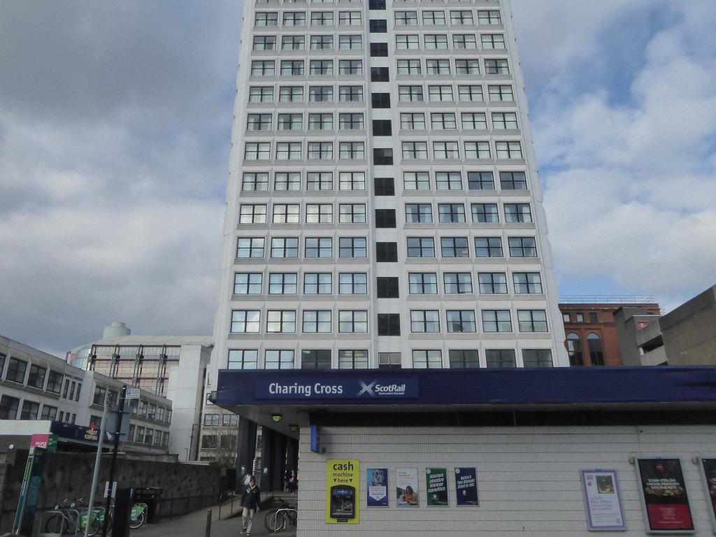 In 1968 it was demolished due to it being in the path of the new Glasgow Inner Ring Road, and the surface access to the station was moved to its eastern end, with a new surface building constructed as part of the Elmbank Gardens office complex in 1971 – the building was designed by the Richard Seifert & Partners.