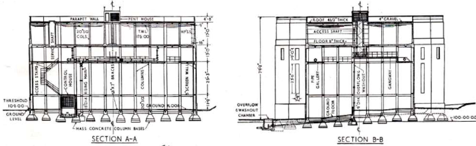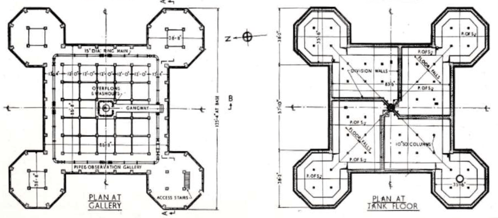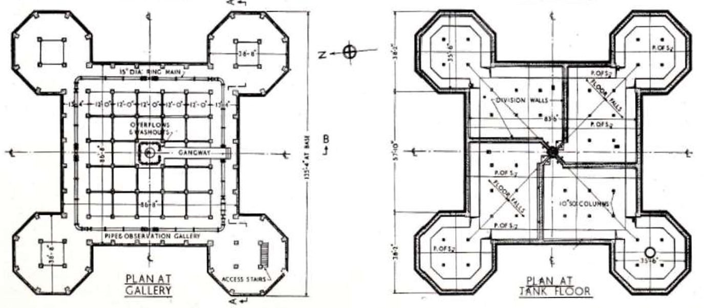 The shape of the tank and supporting structure on plan takes the form of a large central square portion, each corner of which is eclipsed by an octagonal tower seven faces of which are revealed.