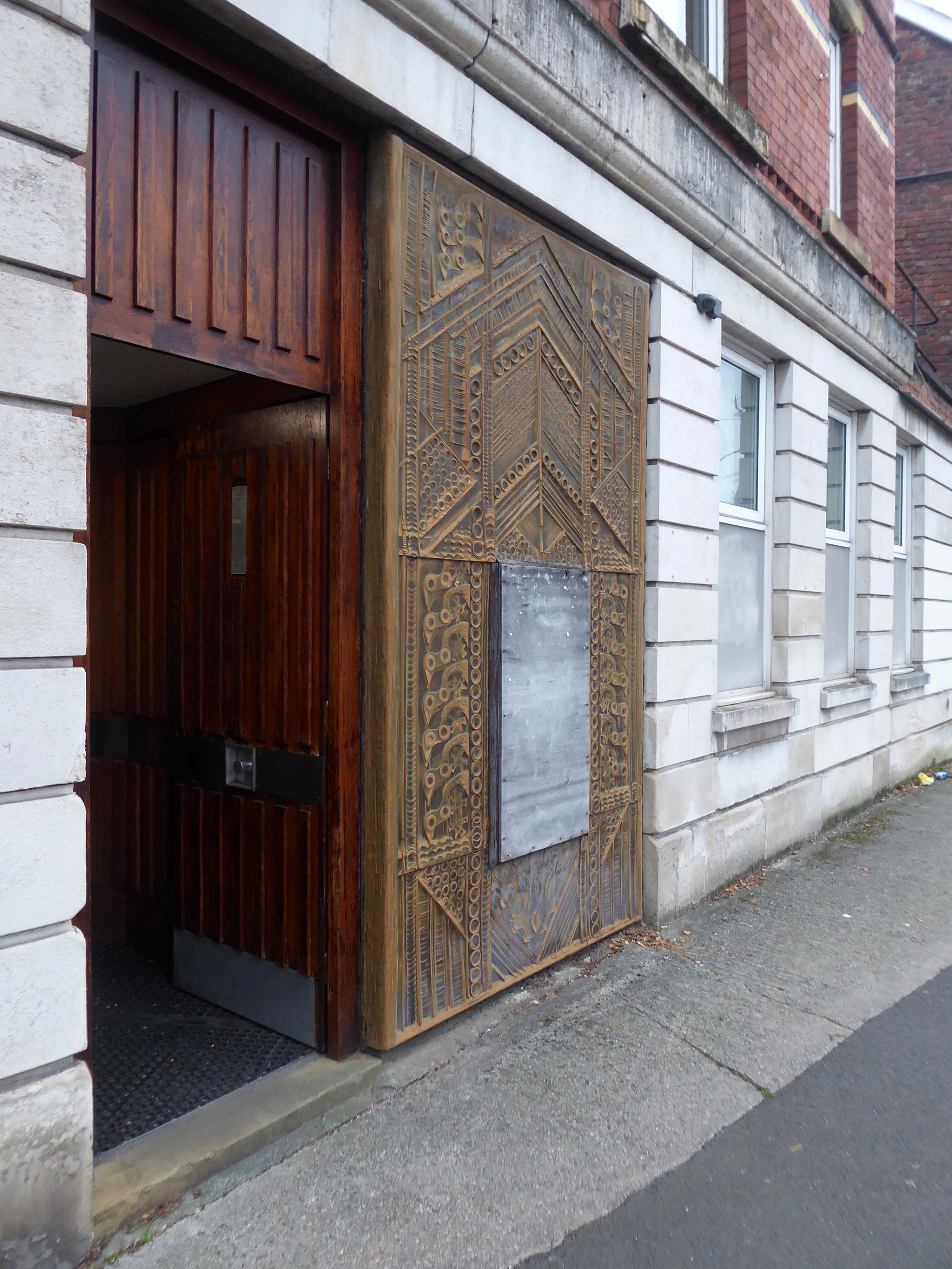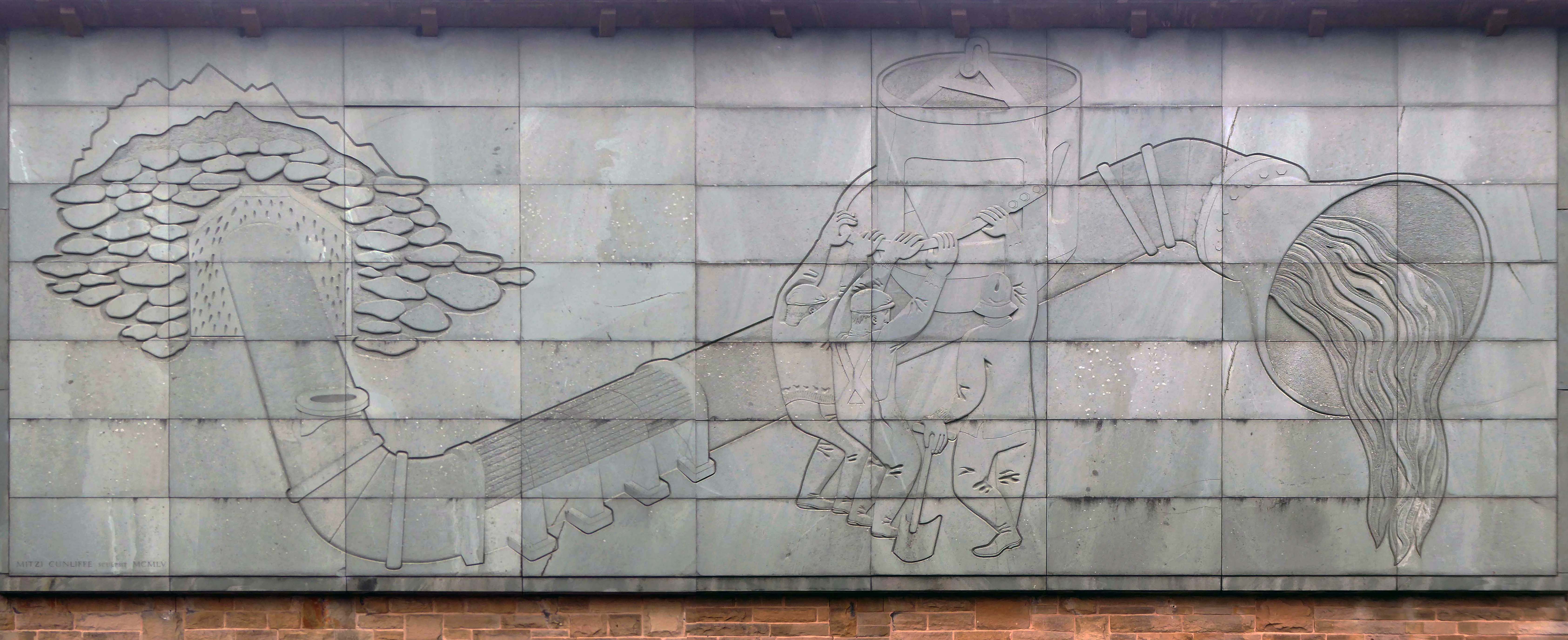 Within the square is a frieze, salvaged from the former Gaumont Cinema, the work of sculptor Newbury Abbot Trent.