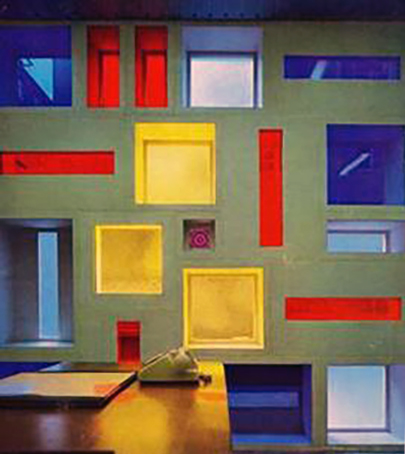 Dalle de Verre stained glass by Patrick Reyntiens, thirty-six panels abstract totalling two hundred and thirty three feet in length.