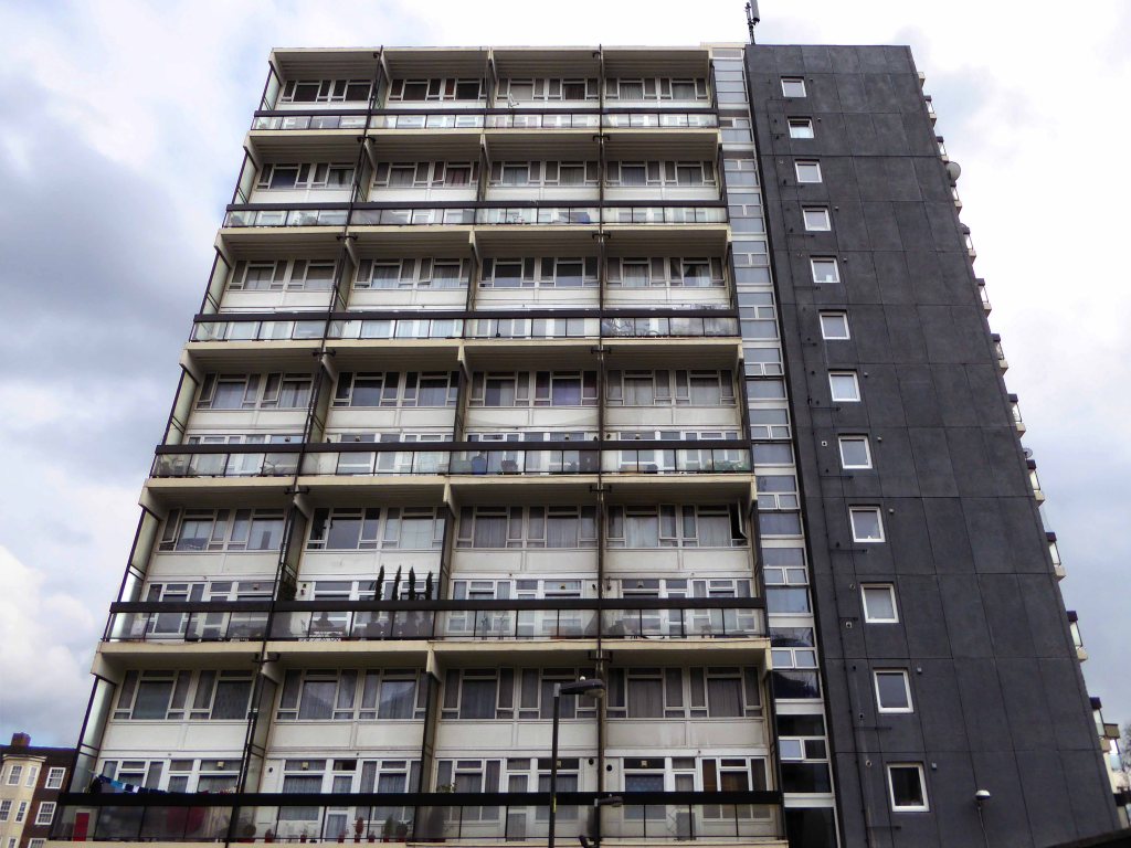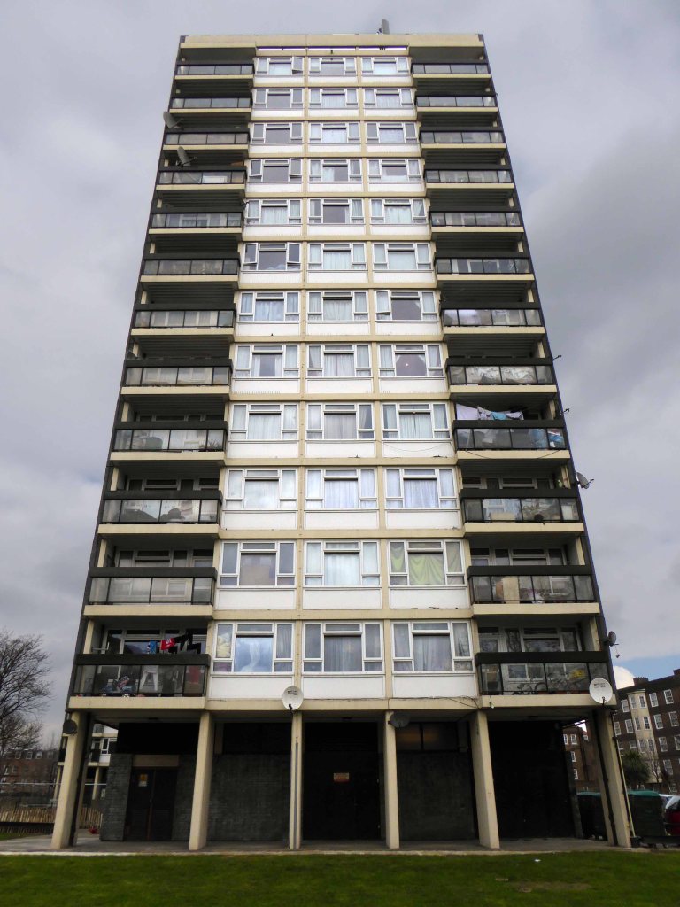 The six-storeyed Mayfield House opened with 54 flats in 1964 on the east side of Cambridge Heath Road, south of the town hall.