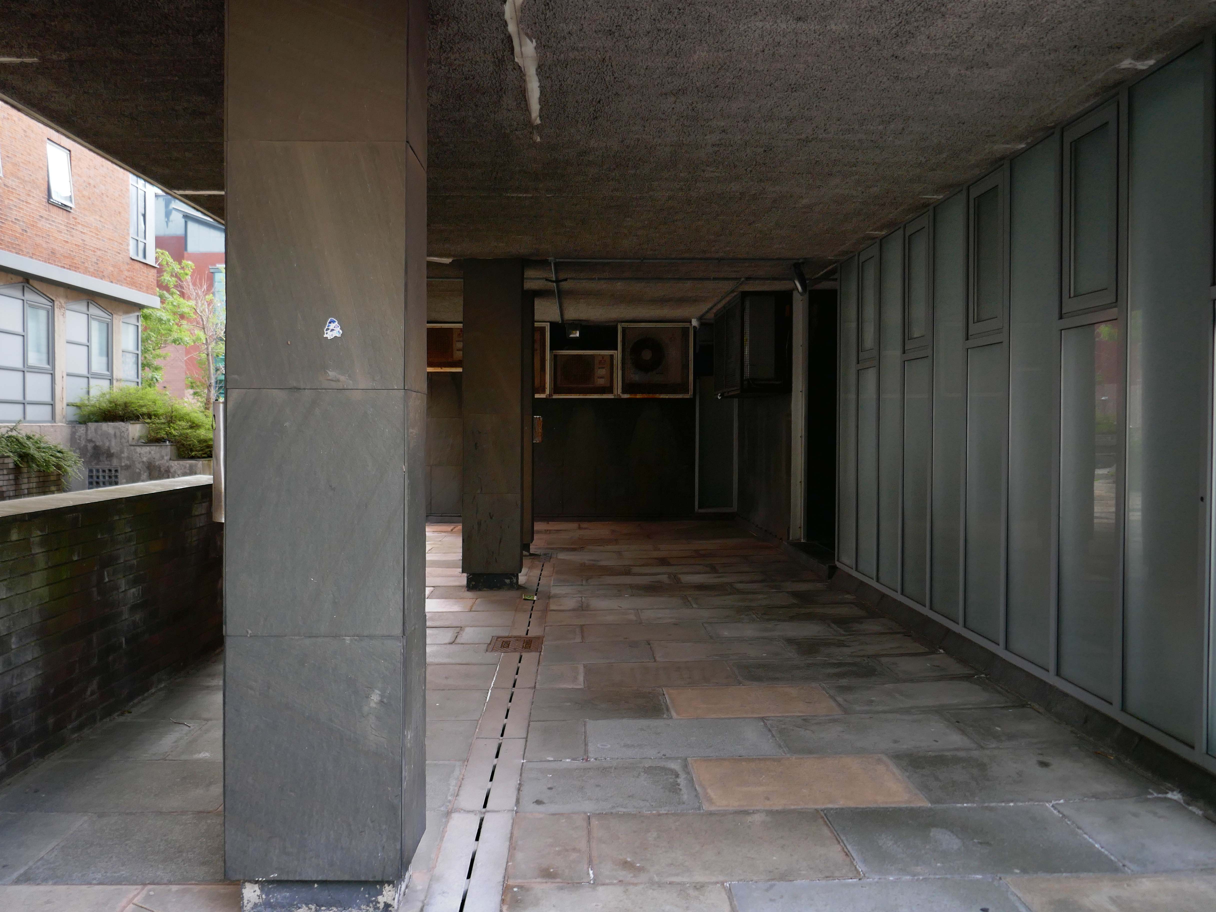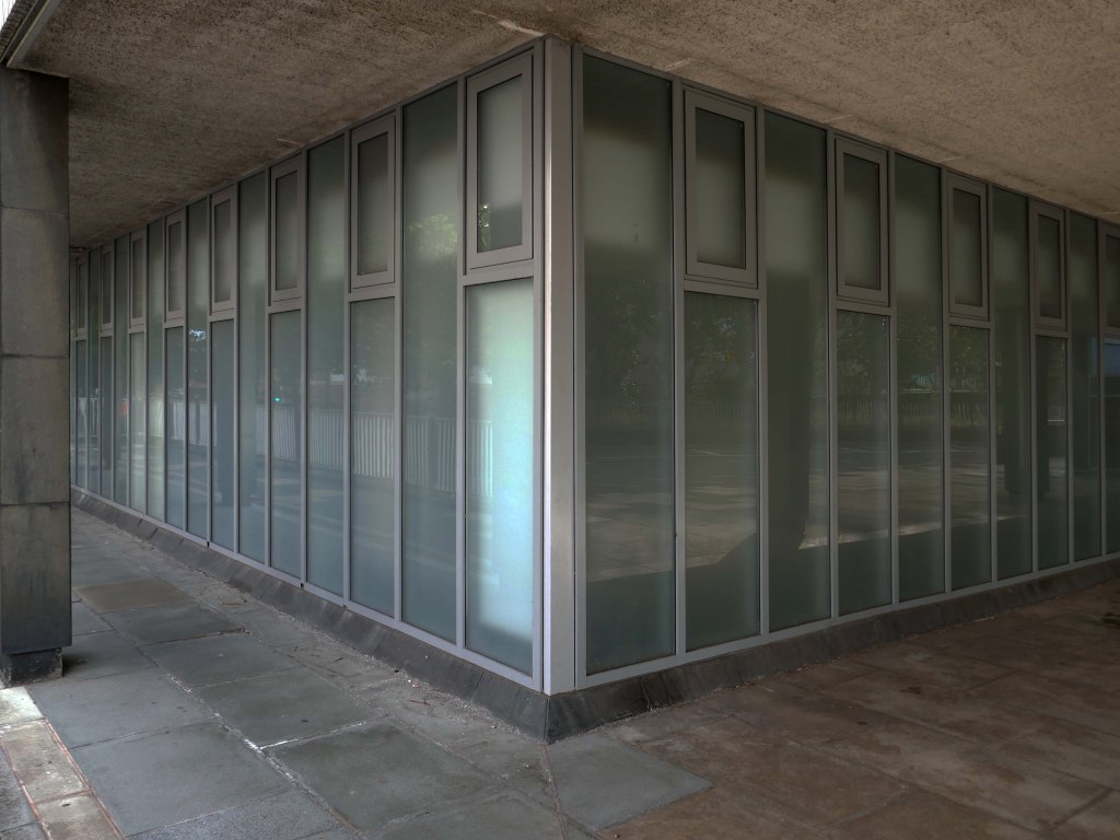 The public space is comparatively dimly lit, with a black ceiling, slate floor and dark-coloured sculptural panels by Eric Peskett placed in echelon so that as you go into the bank the wall appears to be quite solid, but on leaving you see the street through the windows set between the slabs.