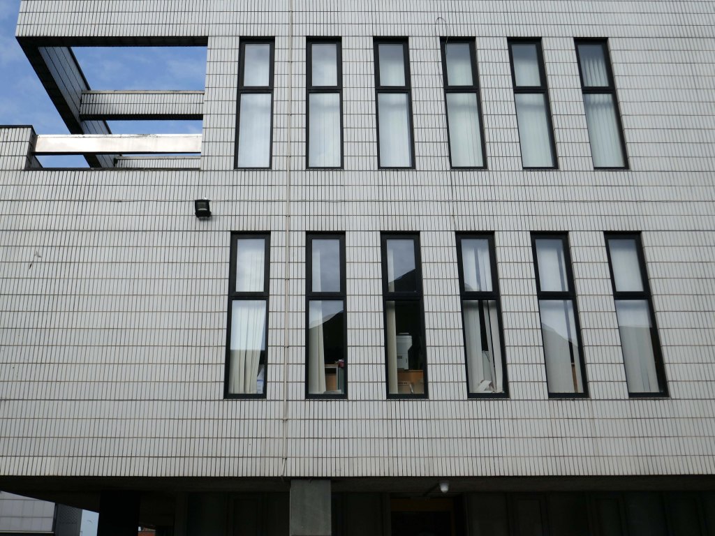 The counter top is a solid piece of Afromosia. The floor is of riven Delabole slate. The sculptured slabs between the writing desks have in parts a very smooth shining surface obtained by casting against glass and the insets are rough and dark, they were cast in rubber moulds. The ceiling is roughly textured Pyrok, dark grey in colour and intensely sound-absorbing.