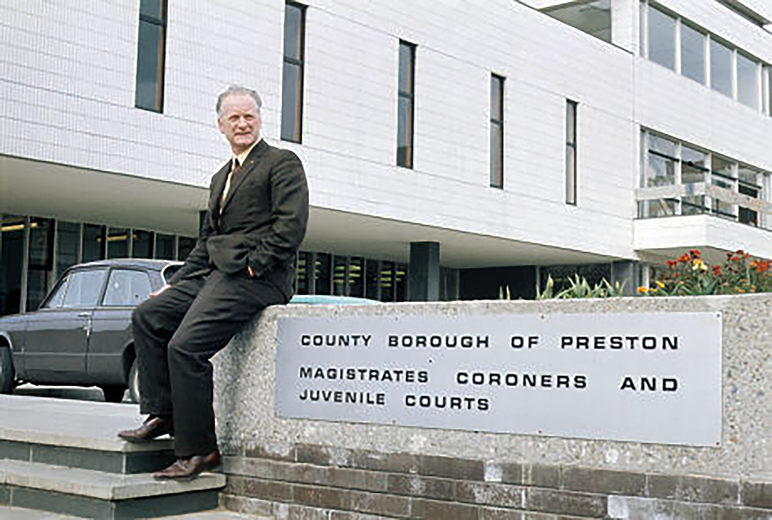 Preston branch today is not merely impressive; it is handsome. The entrance porch is of clear glass but the windows are of hand-made tinted glass set in aluminium frames, the counter is of teak, faced with Sicilian marble, and the walls of the main banking office are of wide elm boarding with one large panel of silver grey marble.