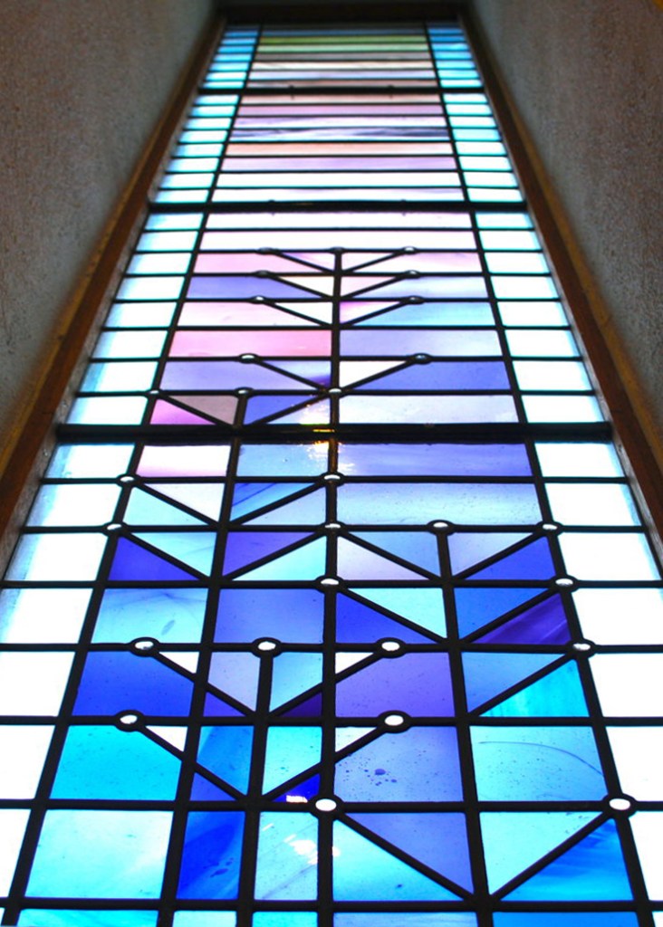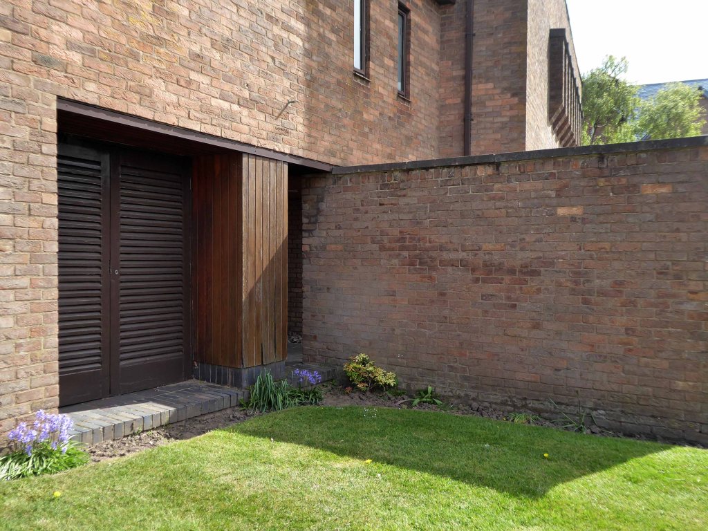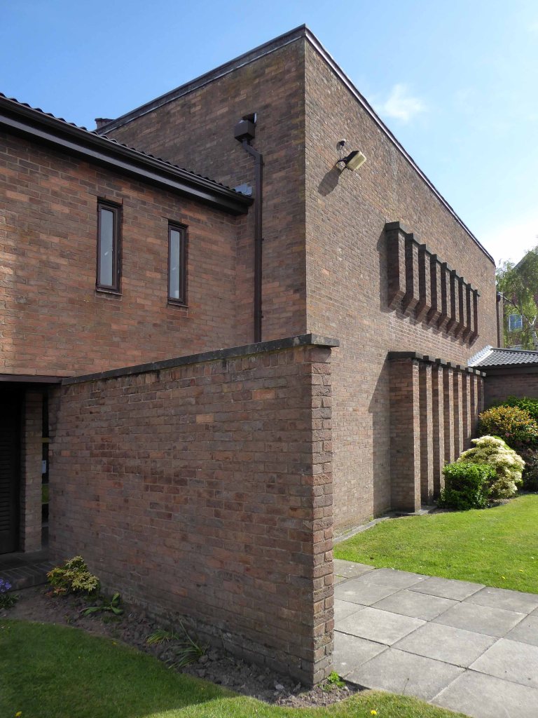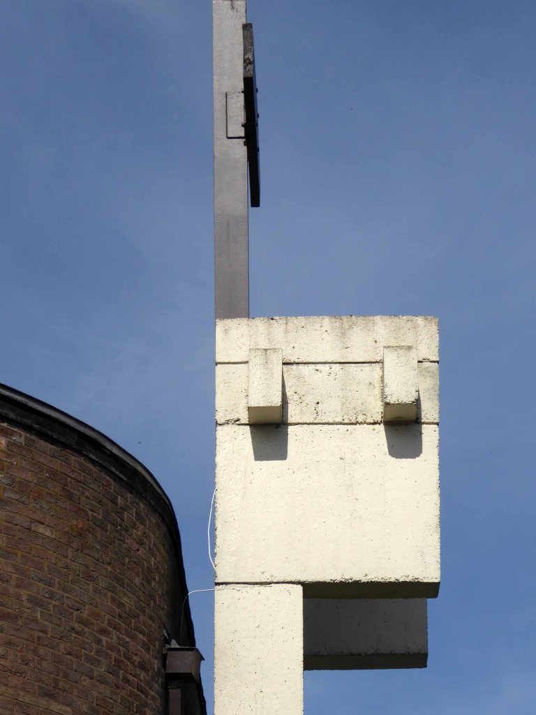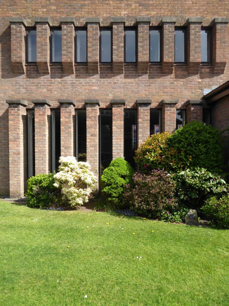 By the mid 1960s, Lubetkin was based at his farm in Gloucestershire, Skinner in London and Bailey in Glasgow. Bailey asked Lubetkin to work out the design of the main staircase and parts of the principal elevation, notably the large cross. Lubetkin’s staircases are particularly spectacular and the St Andrew’s one is no exception. Allan notes that the Lubetkin leitmotif was the controlled collision of straight and curved geometry and this would appear to be exemplified here in the triangular plan geometric staircase which ends in a gentle curve at the ground floor. It is possible that Lubetkin may have influenced the vertical timber panelling in the boardroom. While that in the main hall is smooth and varnished, the boardroom has been sandblasted to present a weathered appearance. At Highpoint Two Lubetkin designed the interior and furniture for the penthouse flat with walls of vertical roughened sand-blasted pine panelling.
