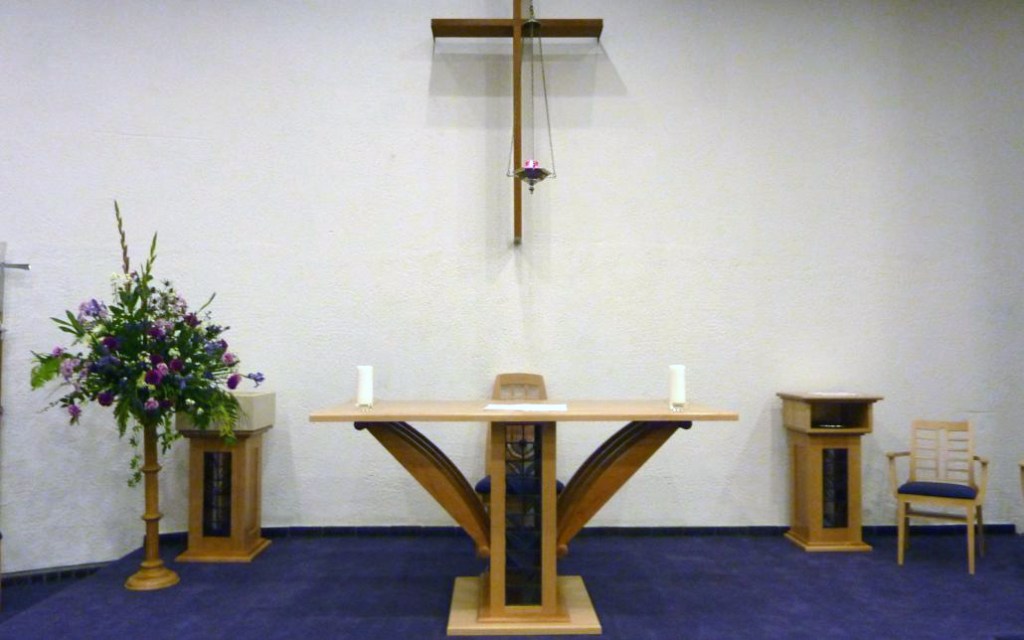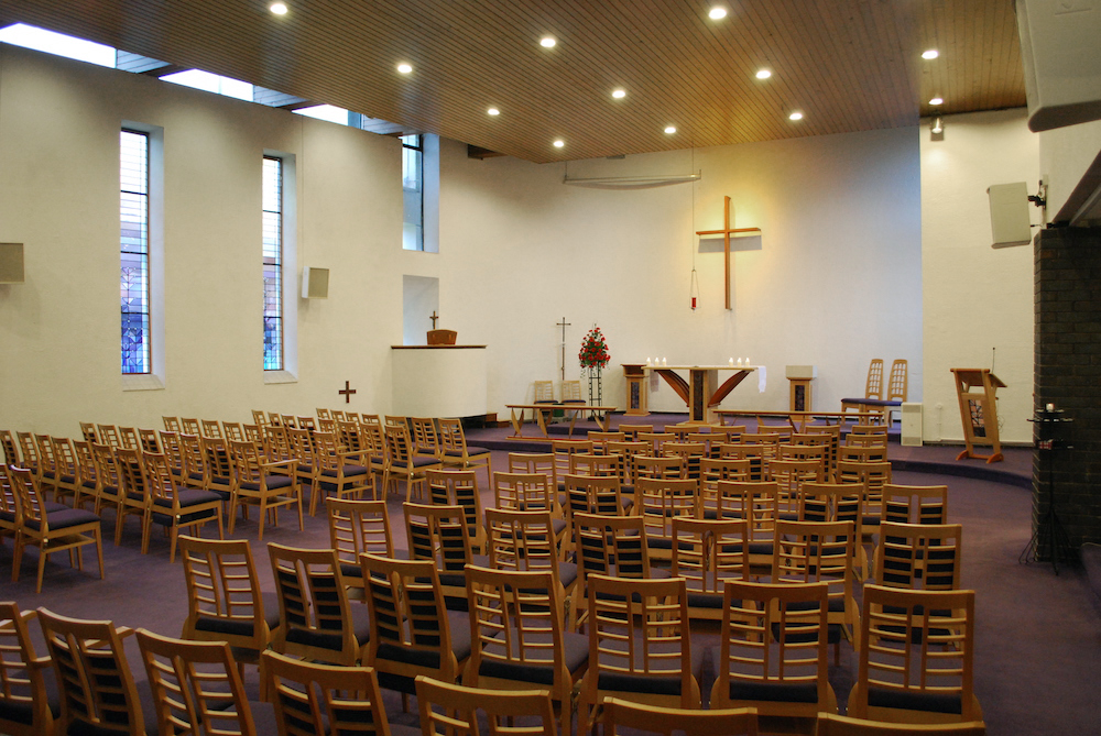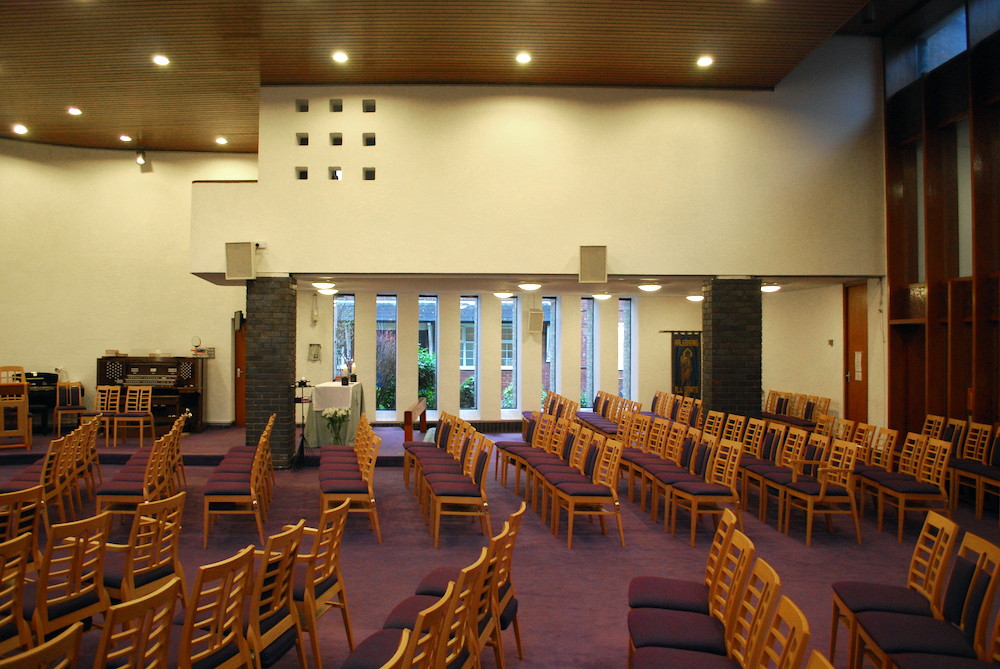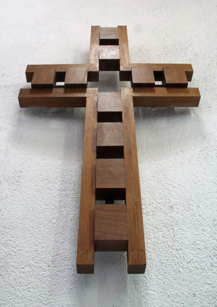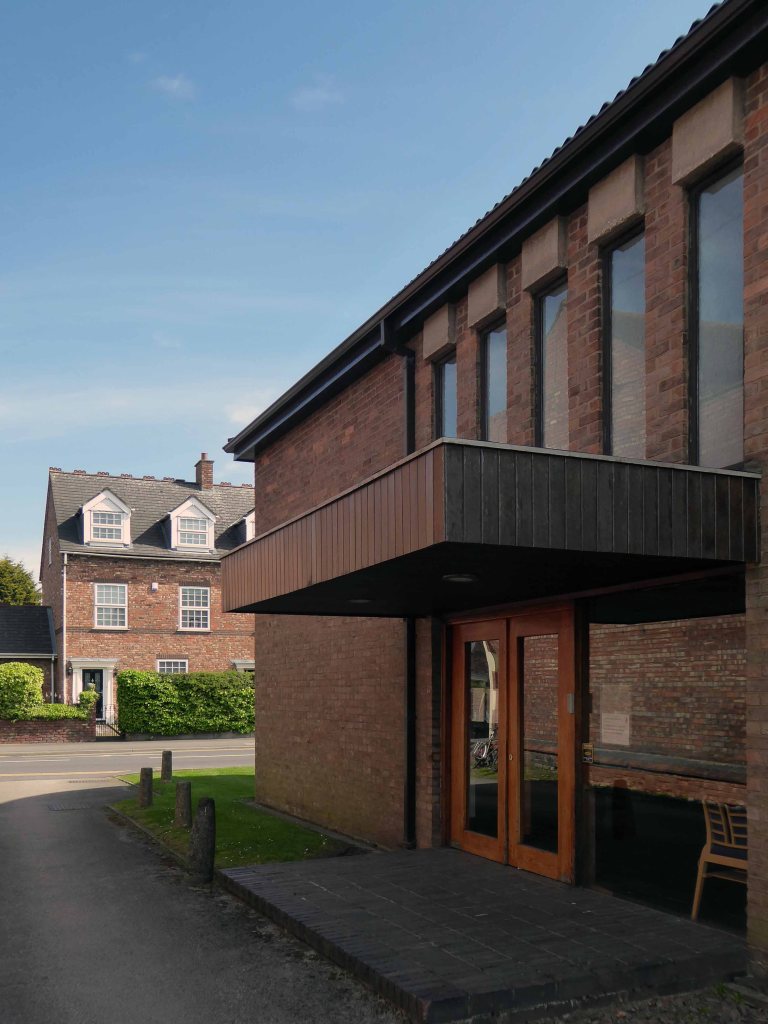 By the mid 1960s, Lubetkin was based at his farm in Gloucestershire, Skinner in London and Bailey in Glasgow. Bailey asked Lubetkin to work out the design of the main staircase and parts of the principal elevation, notably the large cross. Lubetkin’s staircases are particularly spectacular and the St Andrew’s one is no exception. Allan notes that the Lubetkin leitmotif was the controlled collision of straight and curved geometry and this would appear to be exemplified here in the triangular plan geometric staircase which ends in a gentle curve at the ground floor. It is possible that Lubetkin may have influenced the vertical timber panelling in the boardroom. While that in the main hall is smooth and varnished, the boardroom has been sandblasted to present a weathered appearance. At Highpoint Two Lubetkin designed the interior and furniture for the penthouse flat with walls of vertical roughened sand-blasted pine panelling.
