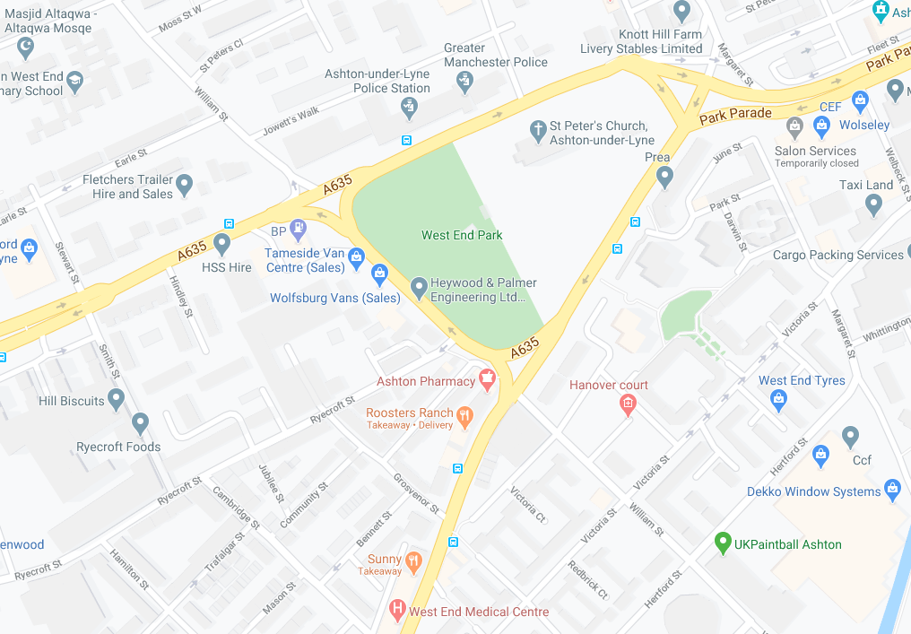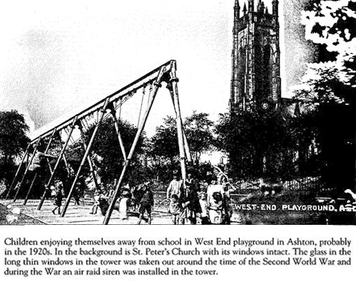 West End Park is a public park, opened in 1893. The site is bounded by Stockport Road, Manchester Road and William Lane. It was developed on land associated with St Peter’s Church.