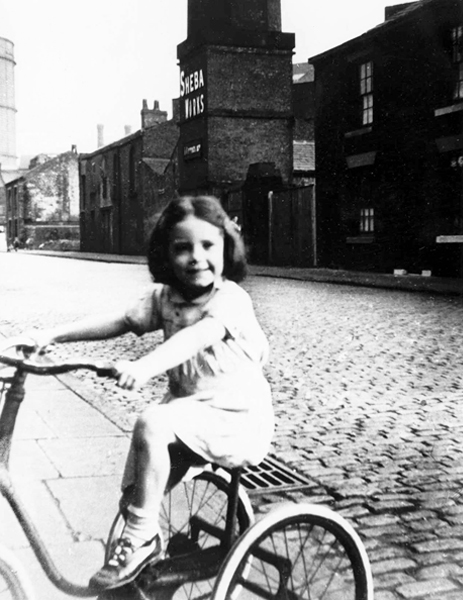 Monica Clarke on her tricycle in Marsland Street, behind her across the cobbled street is the Sheba Works – 1951.