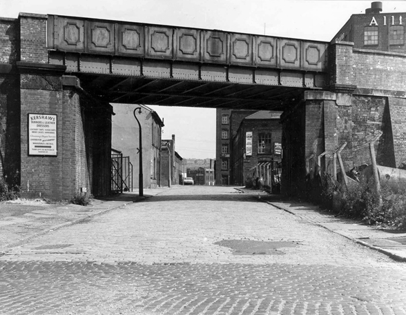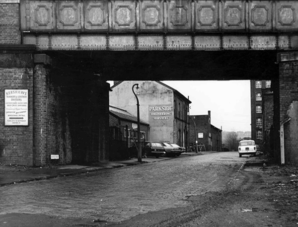 Water Street, Portwood looking north, taken from Avenue Street. Looking underneath the railway bridge, on the left hand side, the first building used to be a public house called ‘The Beehive’, further along was Kent & Swarbrick’s Tripeworks, now a precision engineers, then North West Concrete Works – Easymix. On the right is Coxson’s Brushworks, then the Portwood Mill, Kershaw’s Tannery and the Meadow Mill at the bottom of the street.