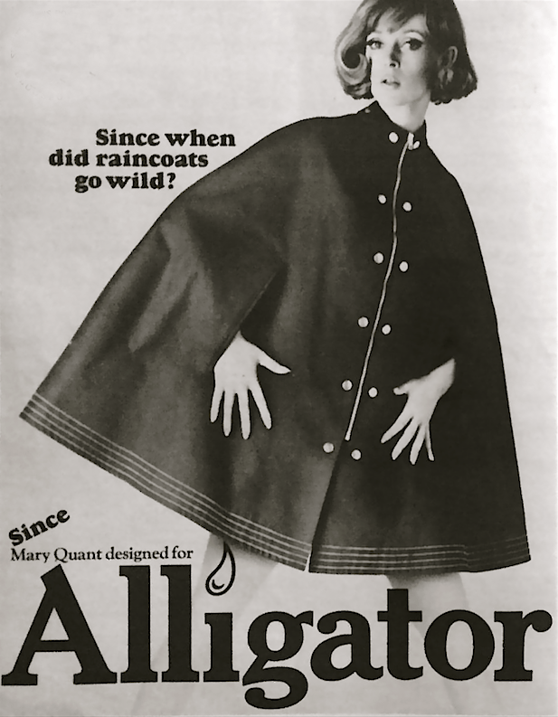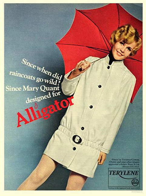 The firm was started after the First World War by Reuben Satinoff, who had previously founded the London Waterproof Company – Silkimac. It was taken over by his sons after the Second World War. For decades, it manufactured traditional weatherproof raincoats in black, brown and beige, but the collaboration with Quant led to new fabrics including PVC and nylon, and a range of bright and vibrant colours.