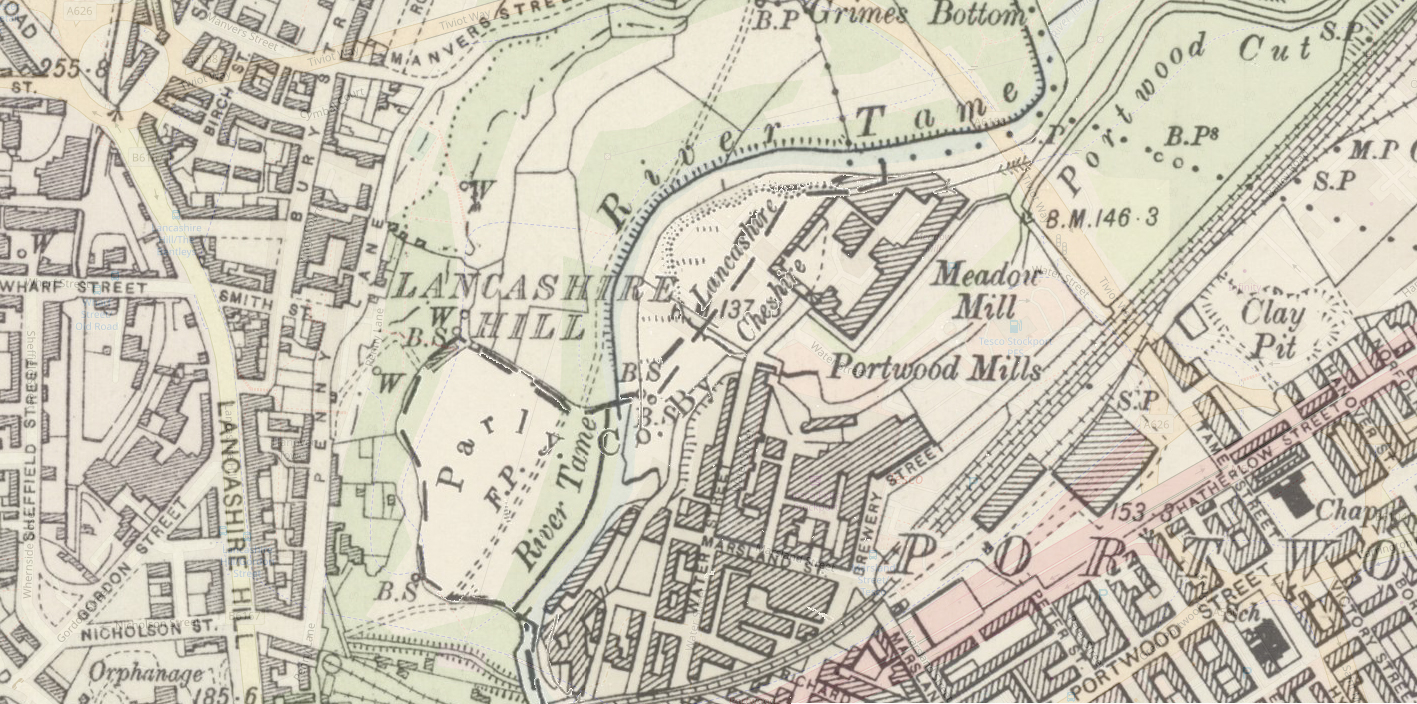 Harrison’s Weir still survives on the river. To the south sections of the Portwood Cut also survive within Reddish Vale Country Park, both as a shallow depression and as water-filled, if somewhat silted and overgrown channel.