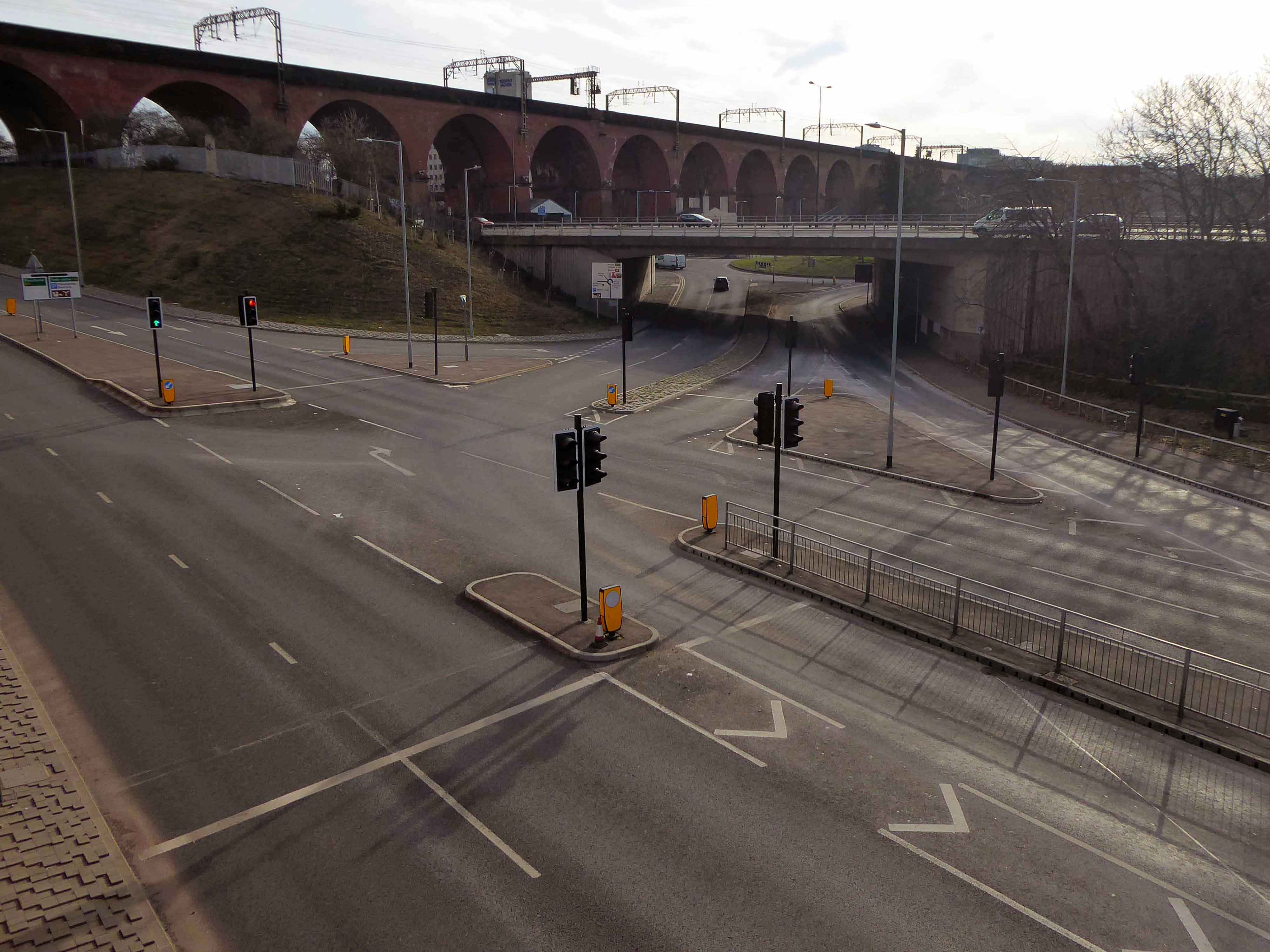 This is one cold day in Covid February, the traffic a little lighter, few folk on foot.
