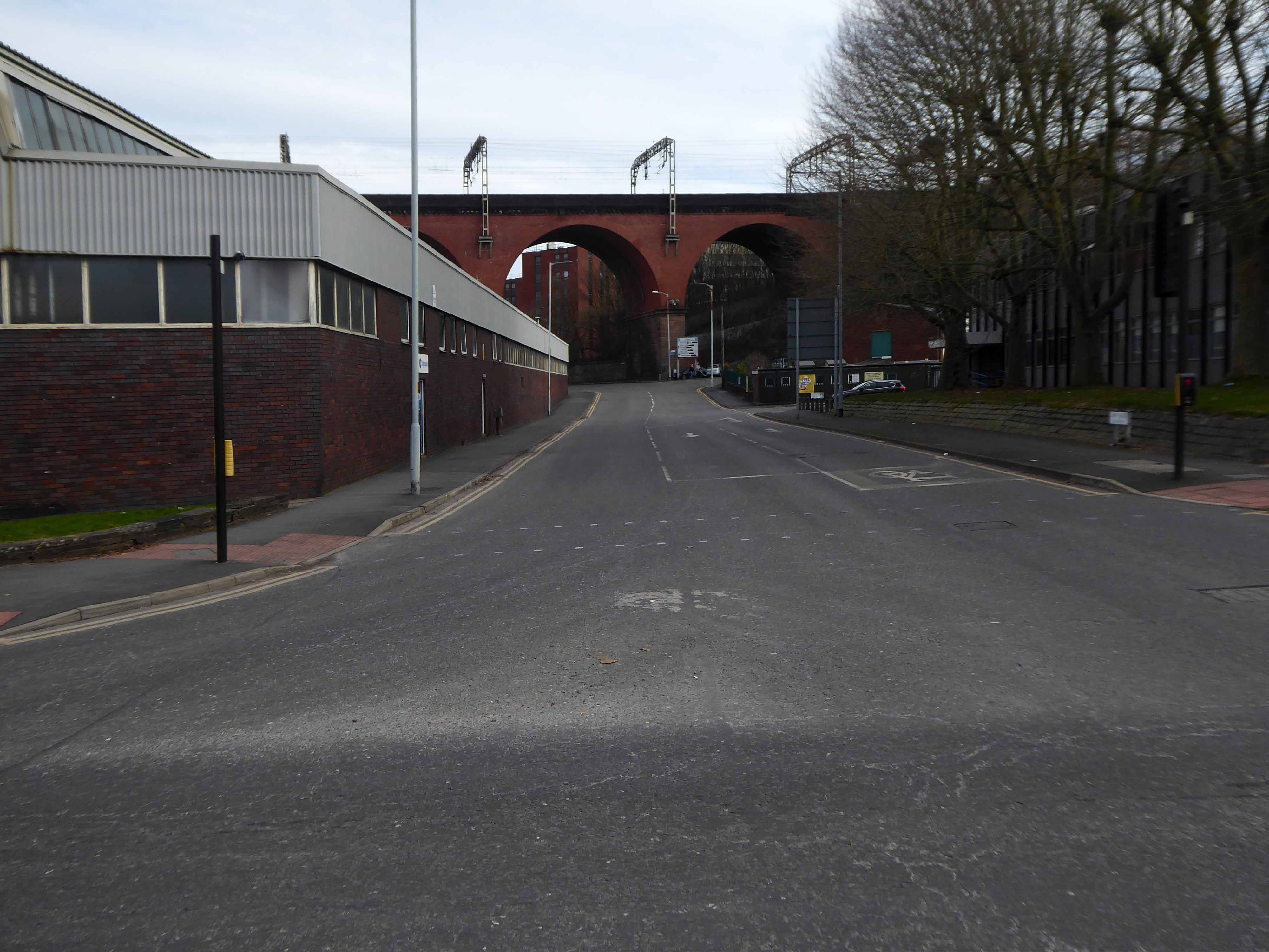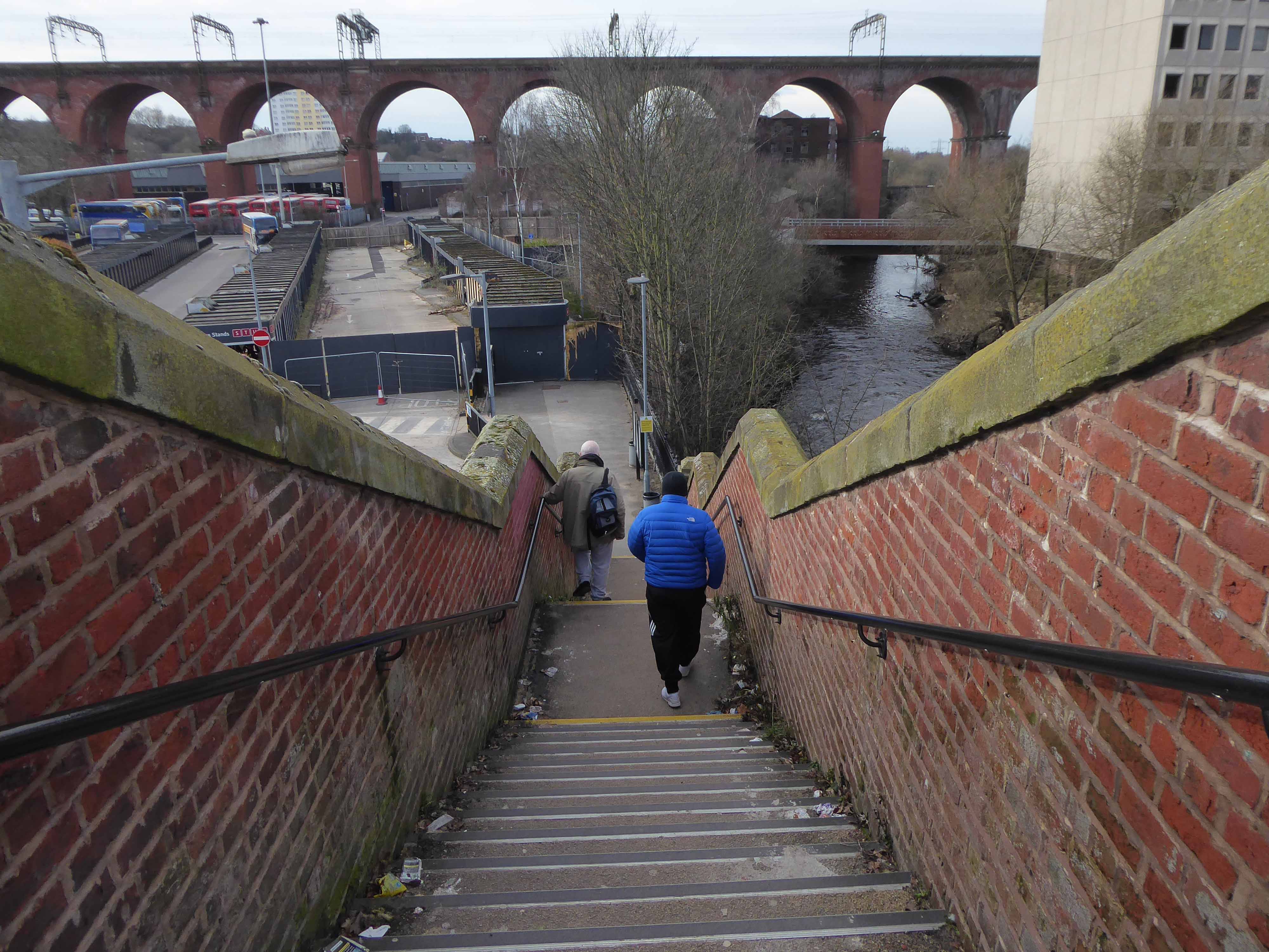 The Hatton Street footbridge has two spans of in-situ u-section deck, is at ground level on the north side, but is reached by steps or ramp from Great Egerton Street on the south.