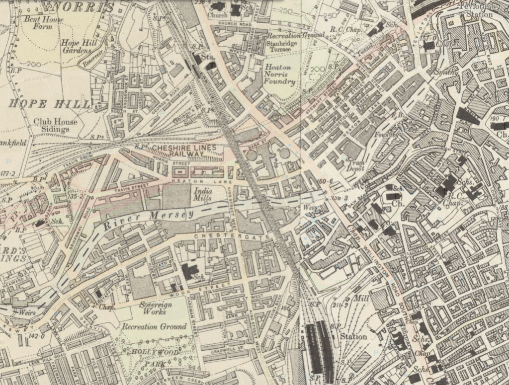 A boon to the modern day motorist, though happily the modern day pedestrian is also catered for in the form of the Hatton Street Footbridge – linking Great Egerton Street below, with Heaton Norris Recreation ground above.