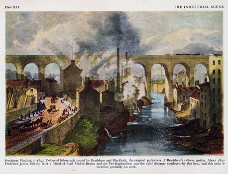 James Harrison bought the manor of Brinnington in the early 1780’s – by 1790 Harrison had three factories in Portwood and others were to follow. In 1796, to provide sufficient water-power to this industrial zone he constructed a substancial millrace. Known as the Portwood Cut, it carried water across the Tame, between his Reddish and Brinnington estates. Harrison also planned the construction of factories at Wood Hall but that particular scheme was abandoned after his death in 1806.