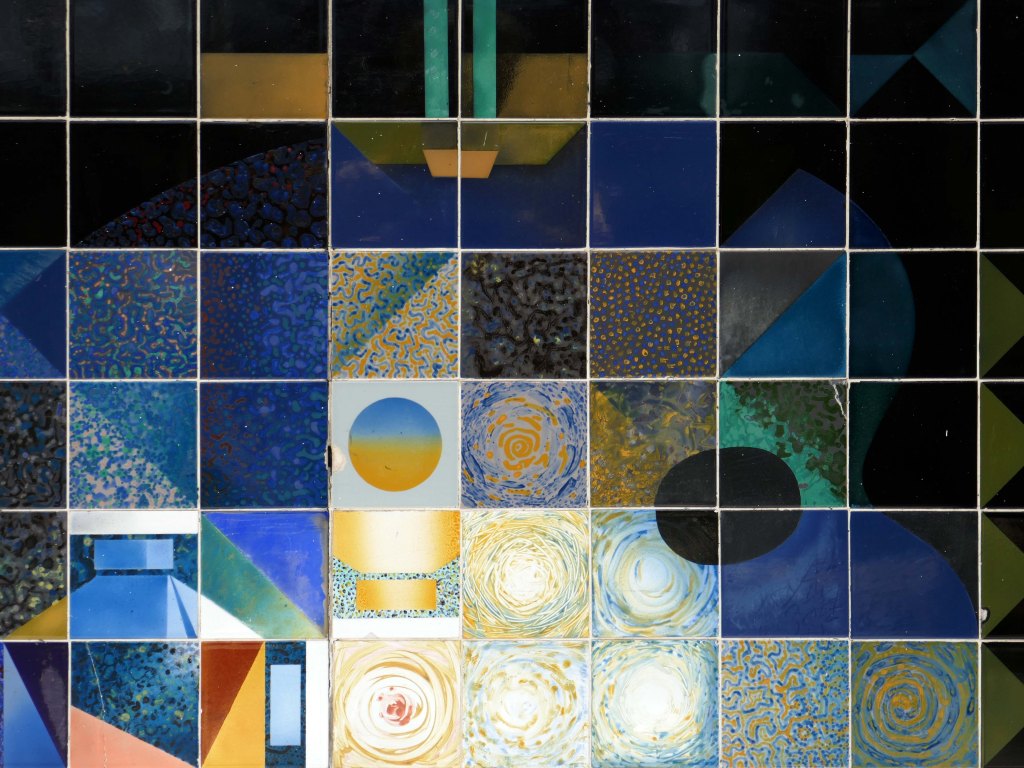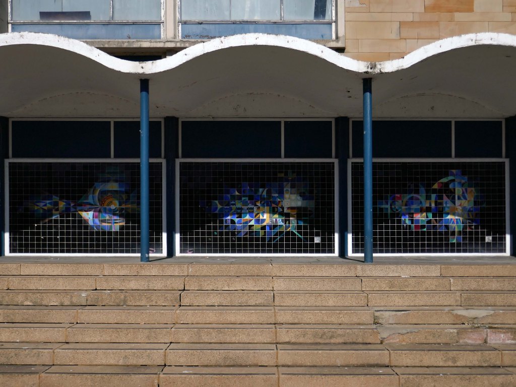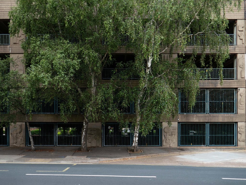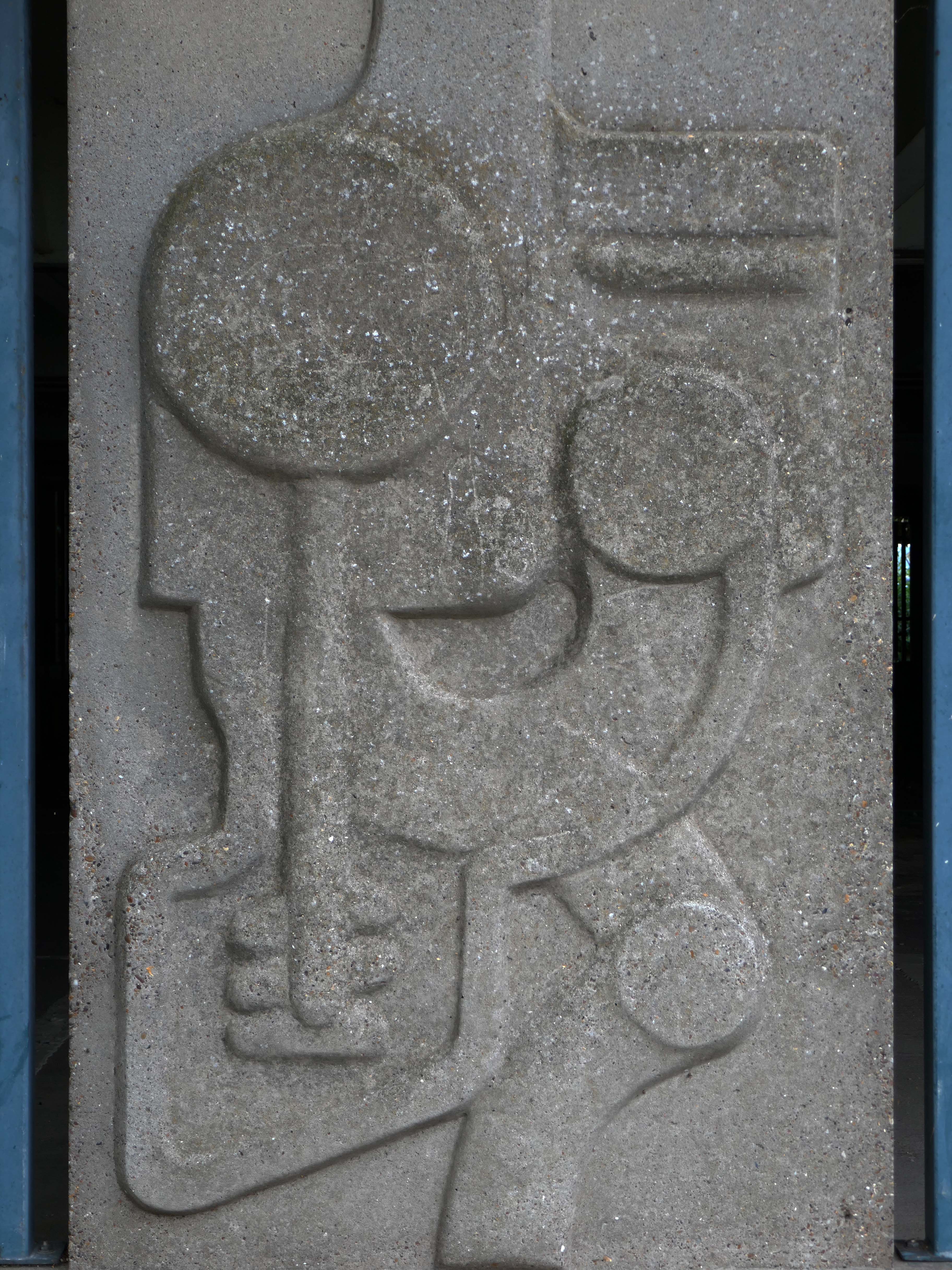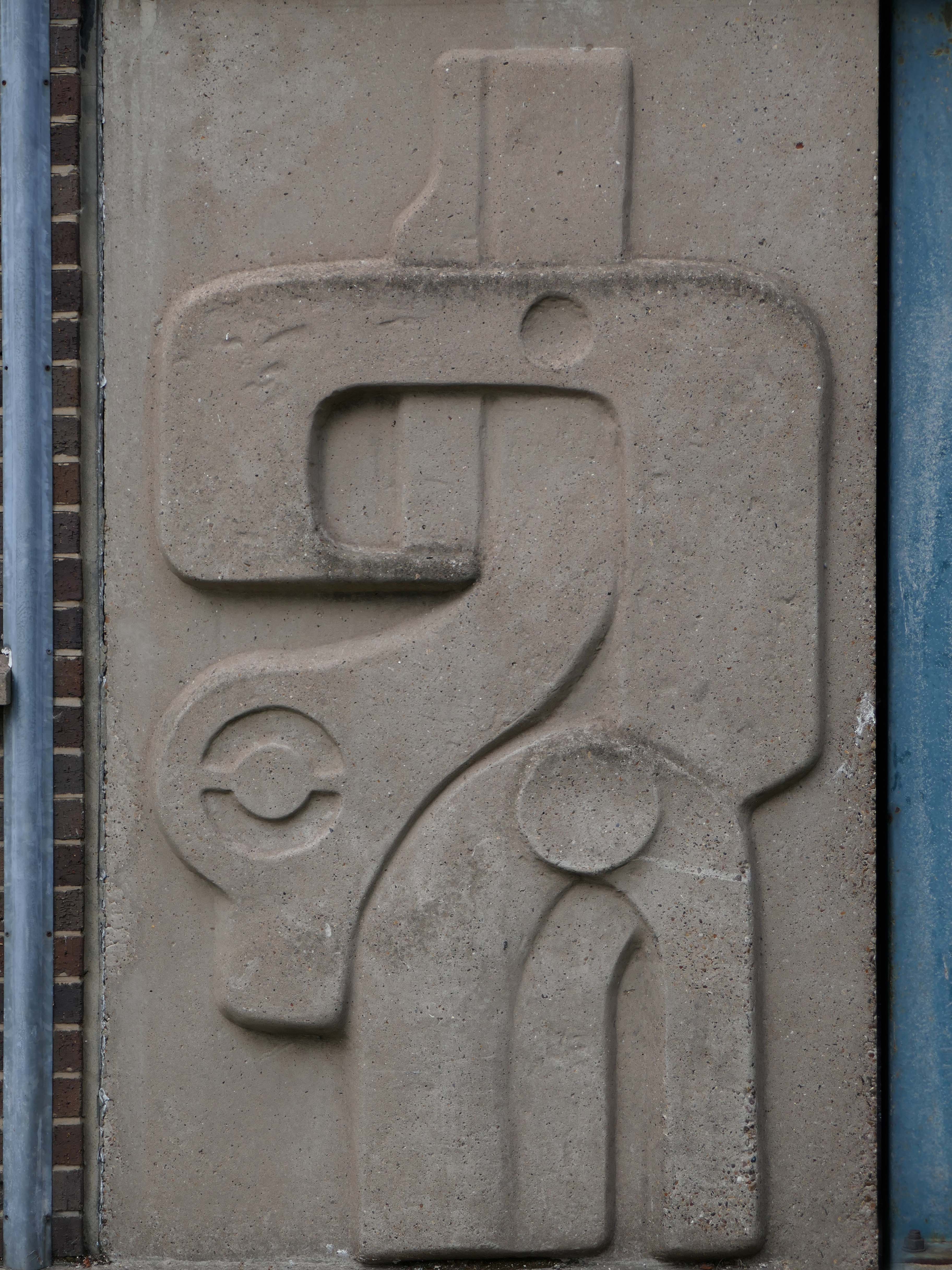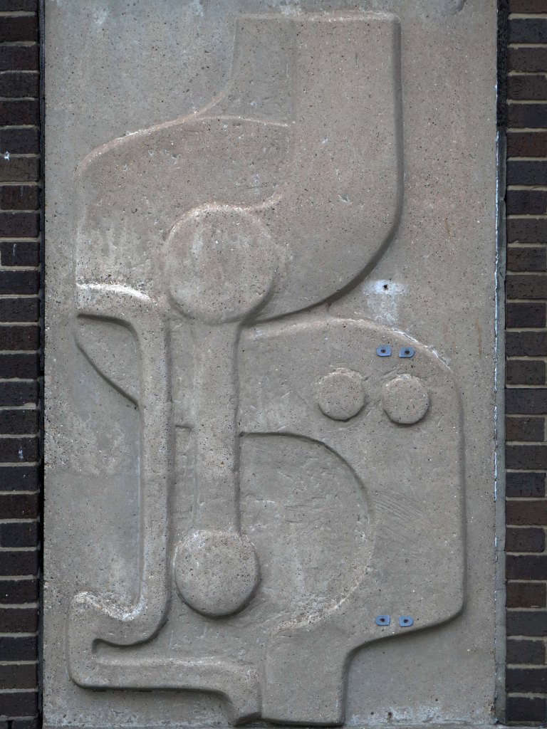 The four abstract concrete reliefs depict parts of a car, which were inspired by drawings in the handbook of the artist’s Austin Cambridge estate car, and were installed when the building was constructed.