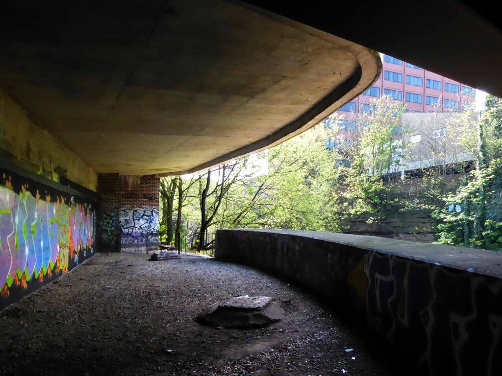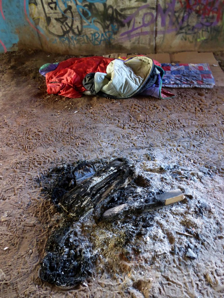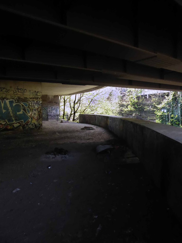 Through the railings and into a void – a void that had become home to the otherwise engaged, seeking solace somewhere, finding shelter from the storm. A storm of Twenty First Century austerity, man made – moving money around until those without are out, out in the open, nowhere else to go but here.