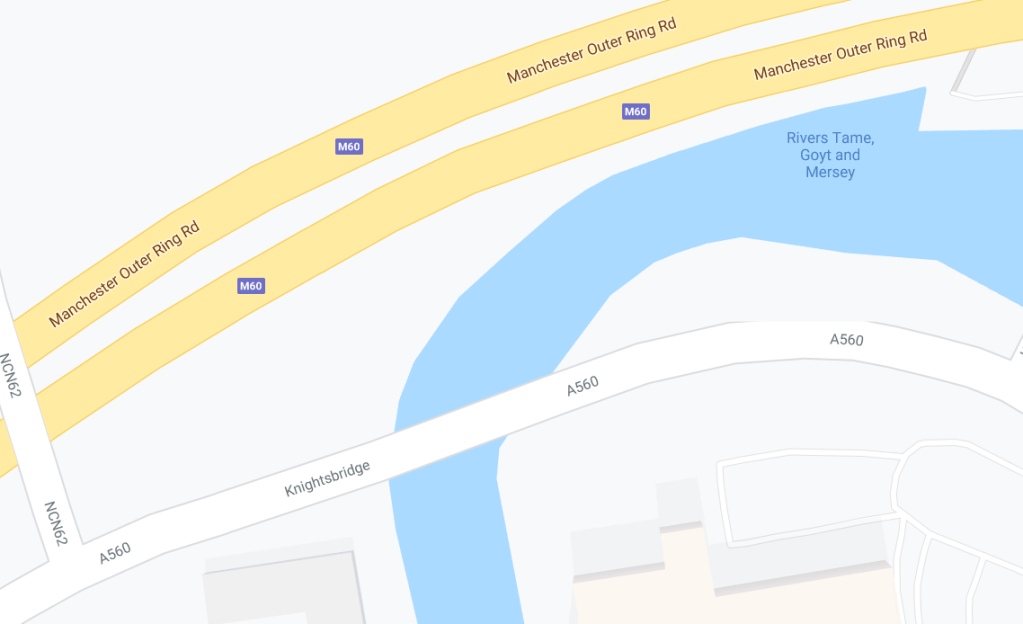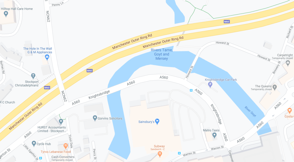 The river then hugs the edge of Annie Lea Playing fields on Buckley Road, until it disappears again as it meets Mount Road, the playing fields are still open ground – the Manchester Cleansing Department, seen on the left – is no more.