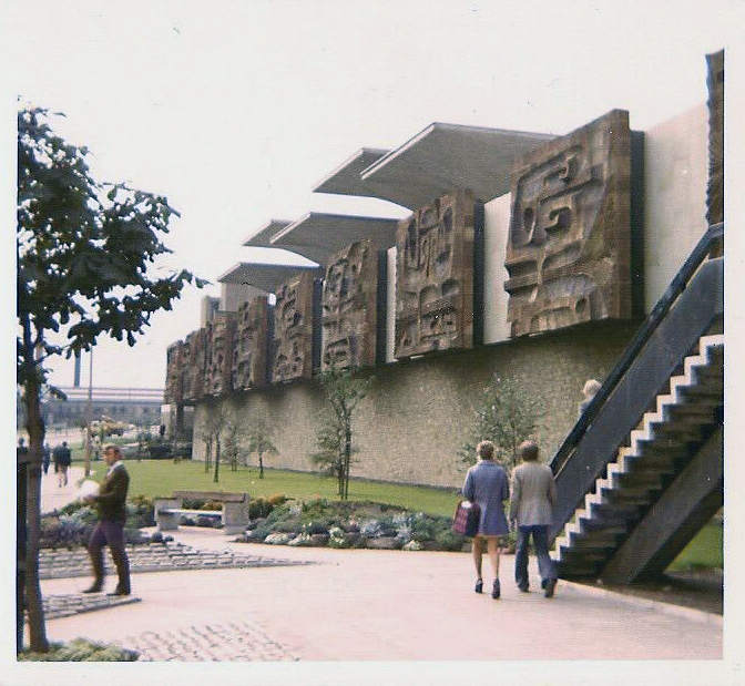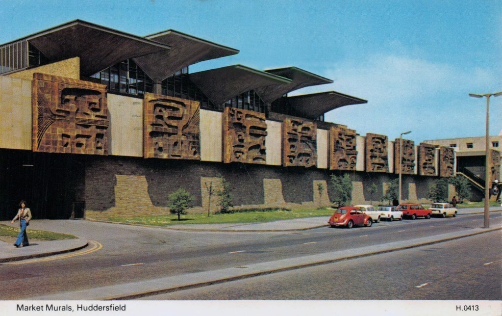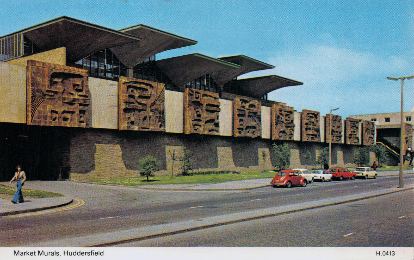 These continue across the façade of the adjoining shops, to make nine panels in all, with a tenth larger panel added in 1972, pierced by stairs and an entrance to the market hall from Queensgate.
