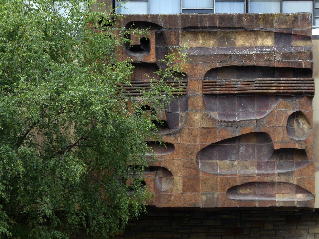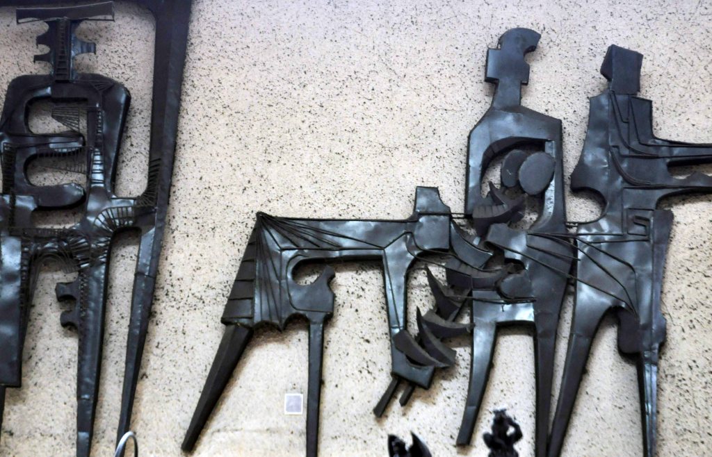 Along the north wall of the hall is a relief sculpture entitled Commerce, in black painted metal with semi-abstract figures representing agriculture, trade and products, also by Fritz Steller.