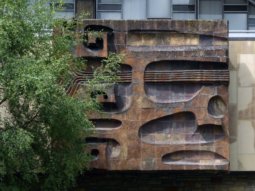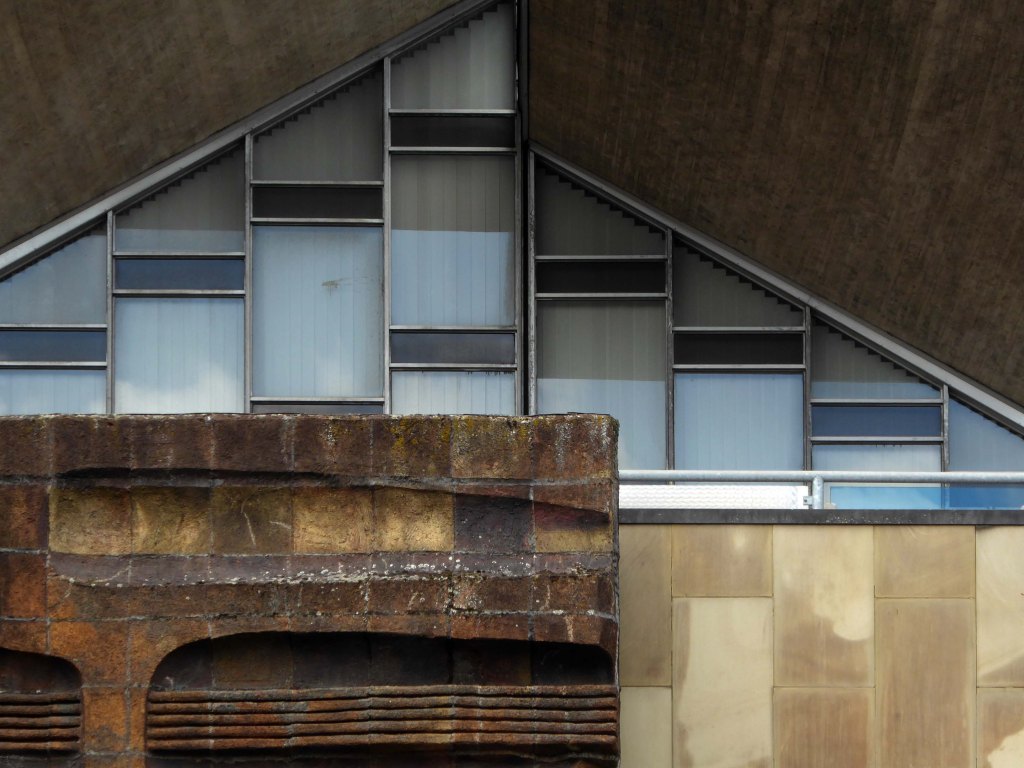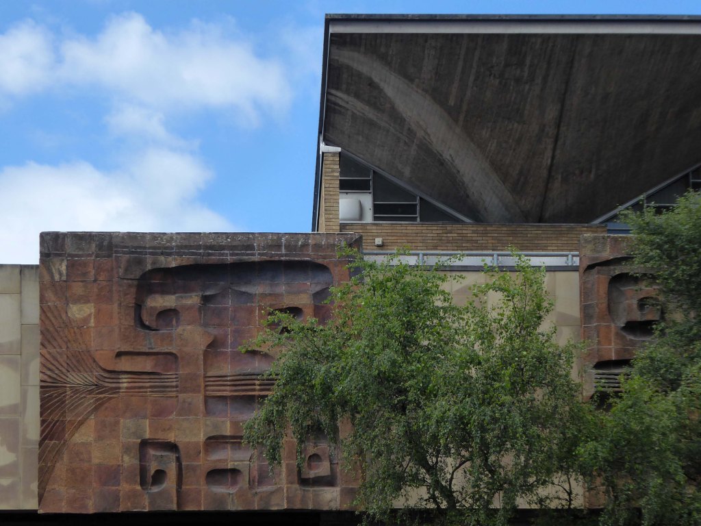 The façade of the market hall on Queensgate incorporates five roof sections with patent glazing and is decorated with square ceramic panels by Fritz Steller, entitled Articulation in Movement, set over natural stone cladding.